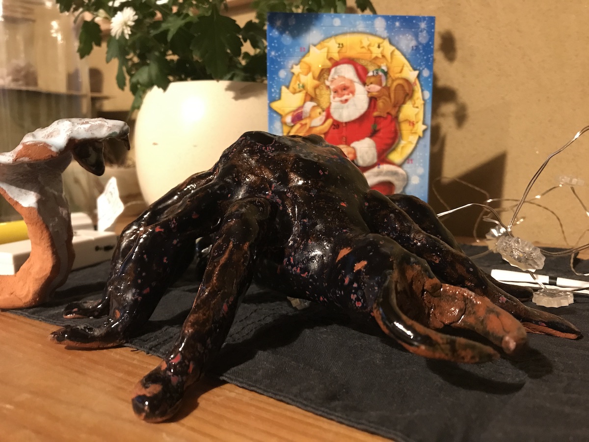 Auf dem Rückweg springe ich noch kurz in den Supermarkt. Der Wolf hatte sich Limonade gewünscht. Ich finde noch ein Spannbettlaken, was ich direkt mitnehme, weil unsere gerade alle kaputt gehen. Nix Konsumauszeit, hehe. Der Sterngucker ist mit dem Bus nach Hause gefahren. ich habe seine Sachen mitgenommen. Er ist Donnerstags immer in der Tonwerkstatt und hat eine Spinnenspardose getöpfert.