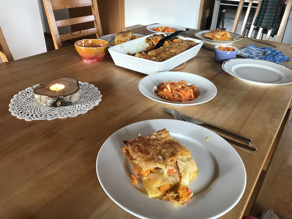 Zum Mittag machen der Mann und der Wolf Kürbislasagne, ich zaubere einen Karottensalat dazu. Karotten, Nüsse und Äpfel waren das einzig Frische im Kühlschrank. Nach dem Mittagessen sind mir die Kinder und die Spülmaschine zu laut, ich brauche eine Pause. Ich lege mich ins Bett und mache ein Nickerchen. Am Nachmittag gehe ich mit dem Wolf zur Trompetenstunde.