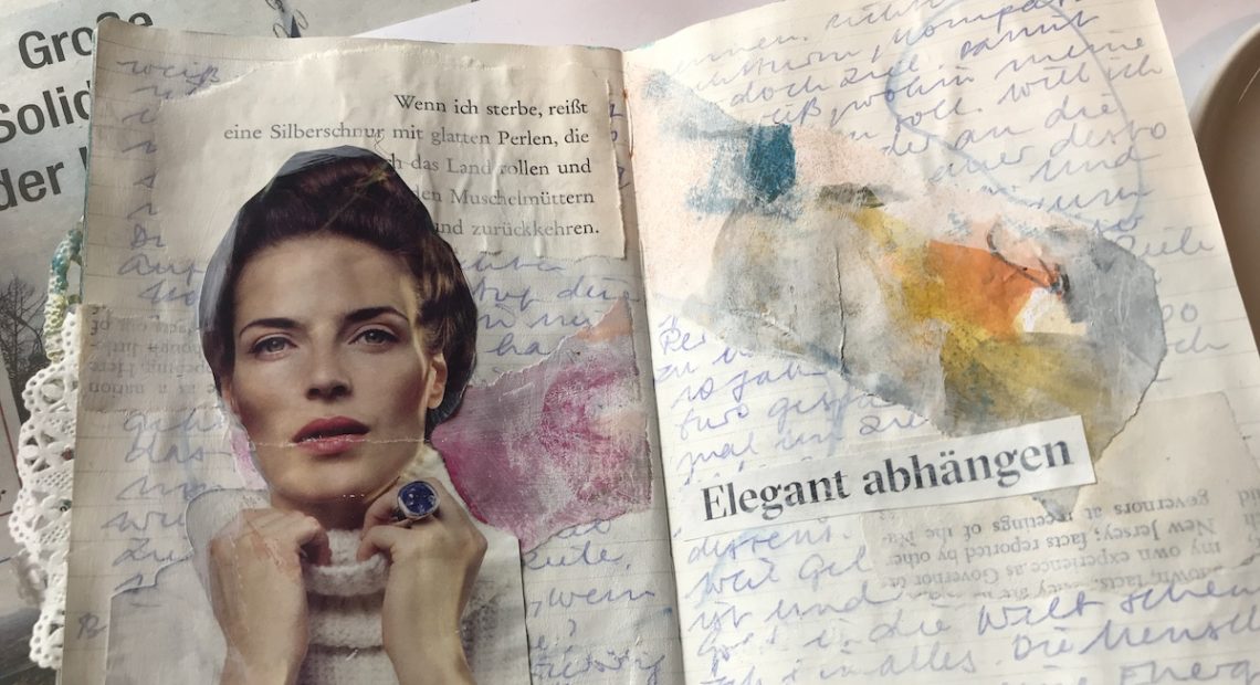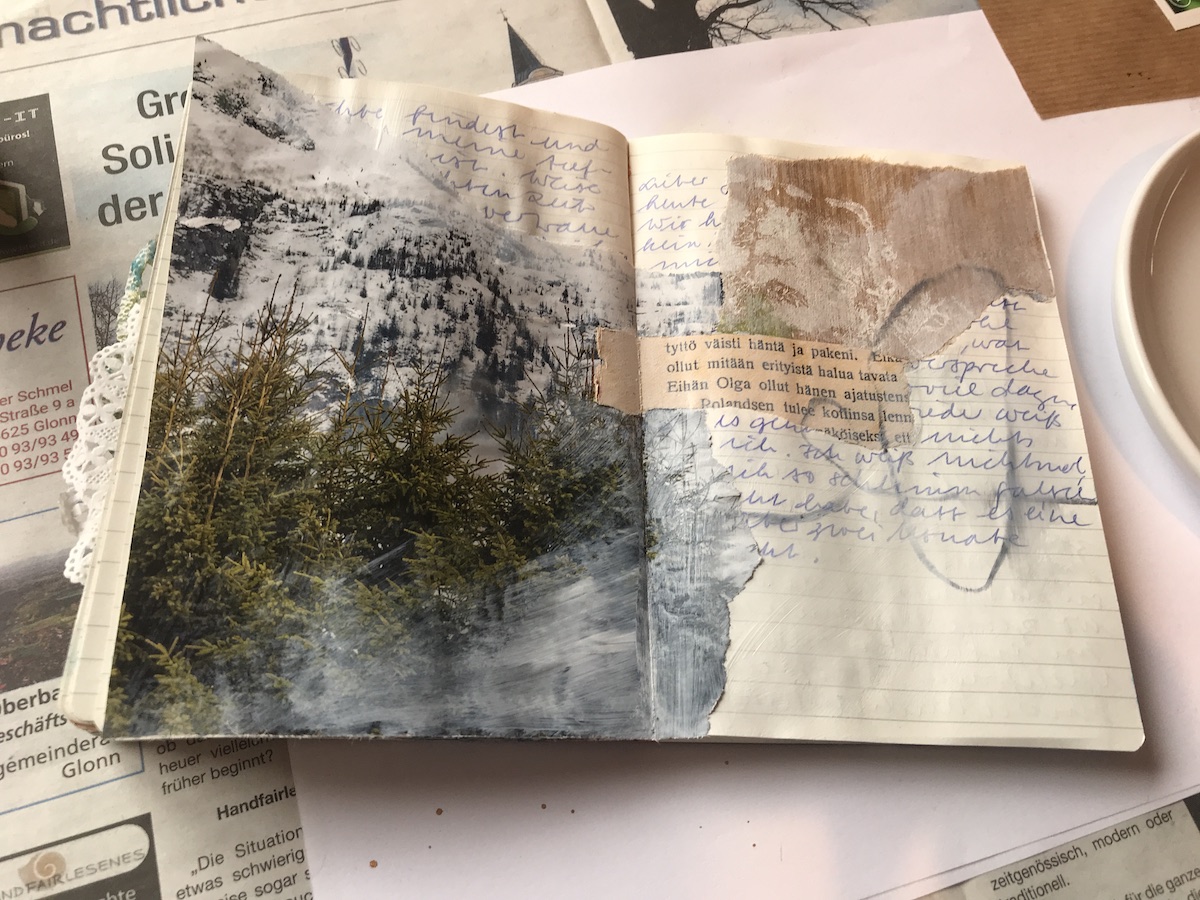 Nach dem Abendessen nutze ich die Zeit noch ein wenig zum Malen und Kleben. Ich probiere gerade die Techniken, die ich im Raw-Onlinekurs bei Amanda Grace kennengelernt habe. Gegen 22 Uhr gehe ich ins Bett und freue mich, dass ich am Samstag ausschlafen kann.