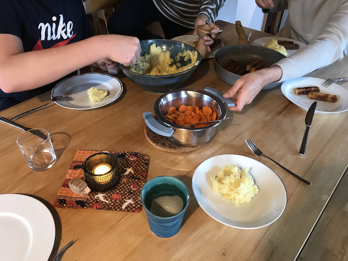 Gegen Mittag finde ich doch ins Tun, aber da ist fast schon Essenszeit. Heute steht Kartoffelbrei auf dem Speiseplan, aber wir haben keine Kartoffeln. Der Mann muss eh zur Post und erbeutet uns gleich noch einen Sack Kartoffeln. Dann kocht er das Mittagessen. Er bemerkt, dass auch Butter fehlt. Ich fahre also schnell nochmal los, Butter kaufen. Es gibt Kartoffelbrei, Karottengemüse und Gemüsestäbchen (diese und diese mit Spinat)