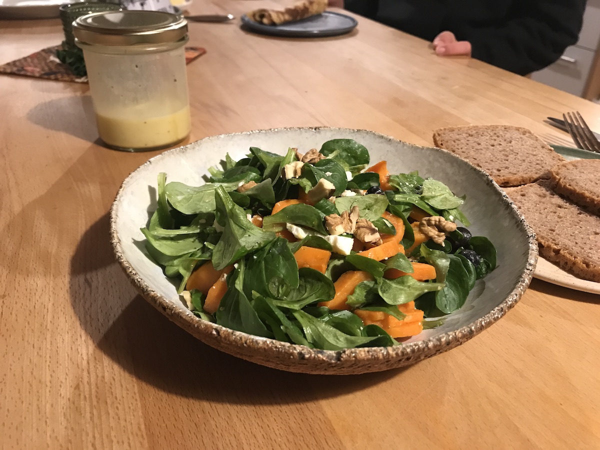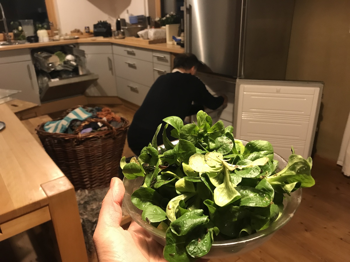 Ein Kunde schreibt von einem Problem auf der Website, das schaue ich mir kurz mit dem Mann an und repariere es. Das geht schnell. Dann fällt uns ein, dass schon seit Wochen unser Gefrierfach vereist ist und abgetaut werden muss. Wir geben uns einen Ruck und machen das gleich. Also hauptsächlich der Mann. Ich bereit derweil Abendessen vor. Der Mann isst Linsensalat. Ich hole mir Feldsalat im Garten und mache mir Feldsalat mit Süßkartoffeln.