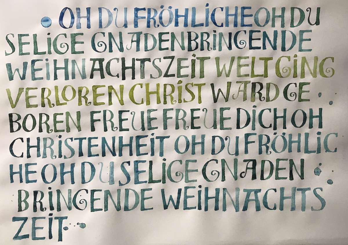 Der Sterngucker ist im Bett, ich nutze die Zeit für mein Kreativprpjekt dieser Woche: Ben Shan Lettering. Das habe ich in einem Onlinekurs von Carol Dubosh im Frühjahr kennengelernt und seit dem aber nicht wieder geübt. Diese Woche habe ich mir vorgenommen, mich jeden Tag ein bisschen damit zu beschäftigen und ein paar Zeilen zu schreiben. Es entsteht ein Geschenkpapier. Ich kann mir das Layout auch für eine Weihnachtskarte vorstellen. Dazu würde ich es aber nochmal auf anderem Papier schreiben.