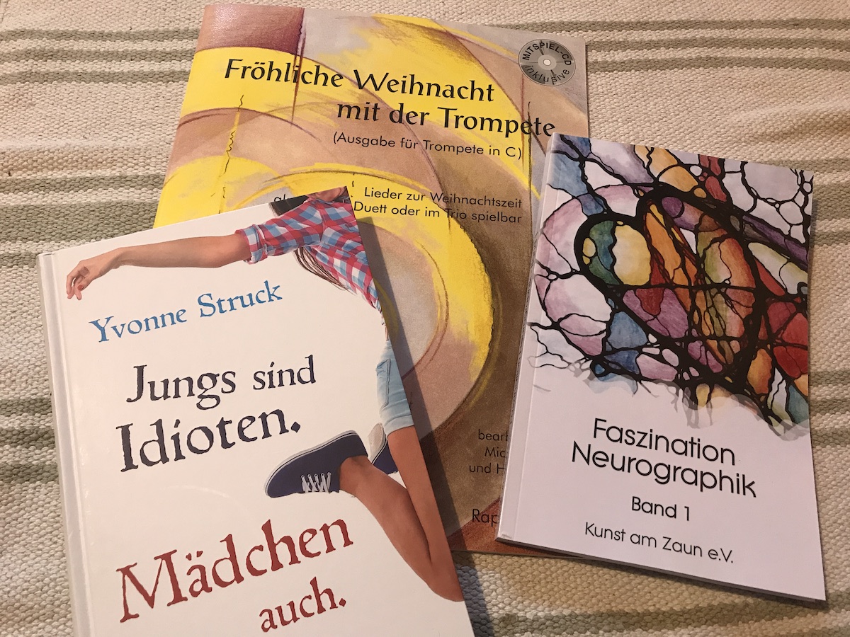die Putzfrau, Sonne (=warmes Wasser, ich nutze das und wasche meine Haare), Überraschungspost aus dem Internet: 2 Bücher von meiner Wunschliste (Danke!), der Trompetenlehrer bringt ein Übungsbuch mit Weihnachtsliedern für mich. Und weil ich jetzt einen CD Player habe, kann ich mir die Übungs-CD’s dazu anhören, hehe. Freundinspaziergang, die tolle Gemüsesuppe vom Mann, der Fotoalbum-Abend, der Weihnachtscollage-Kurs freut Menschen <3