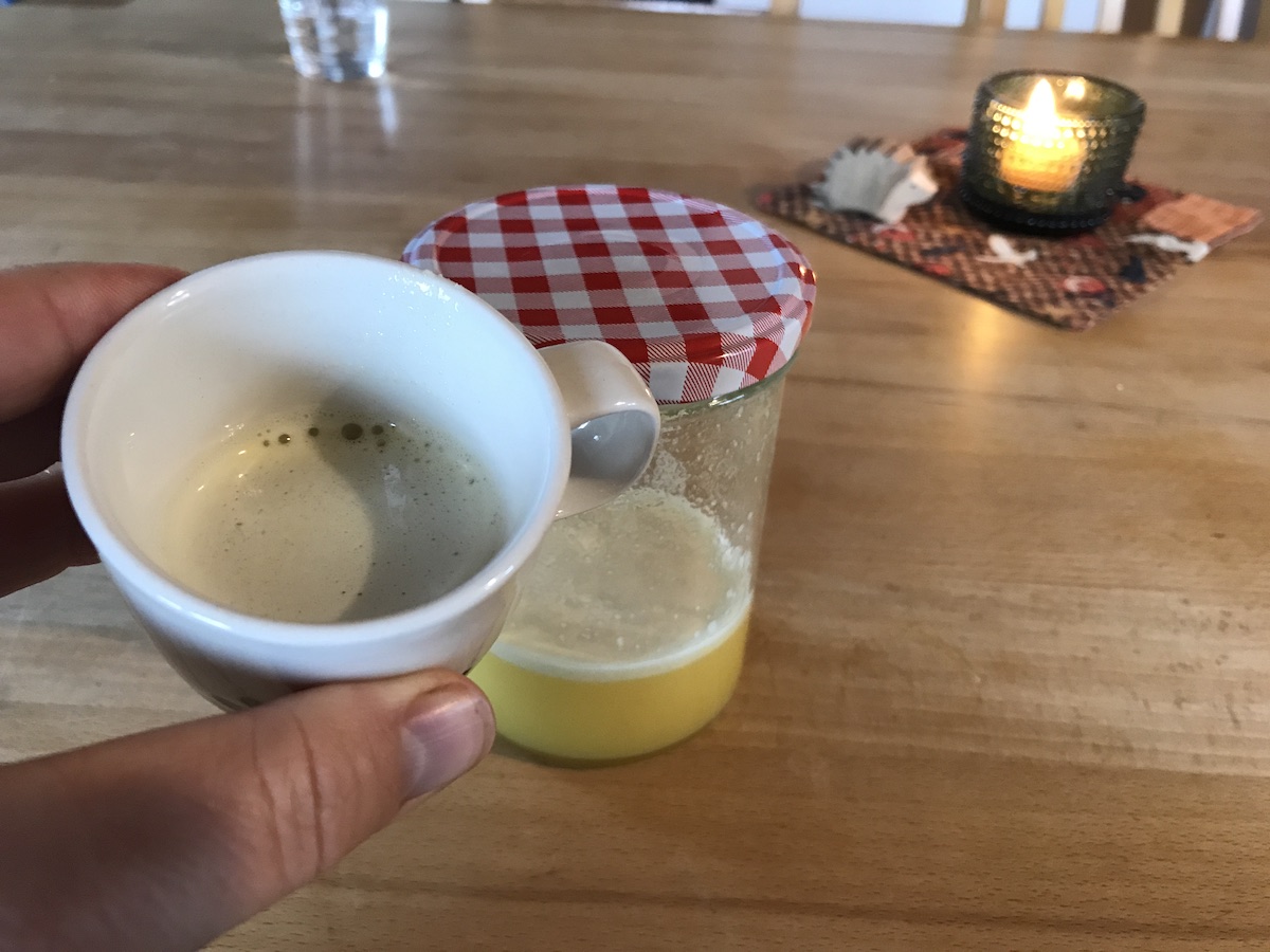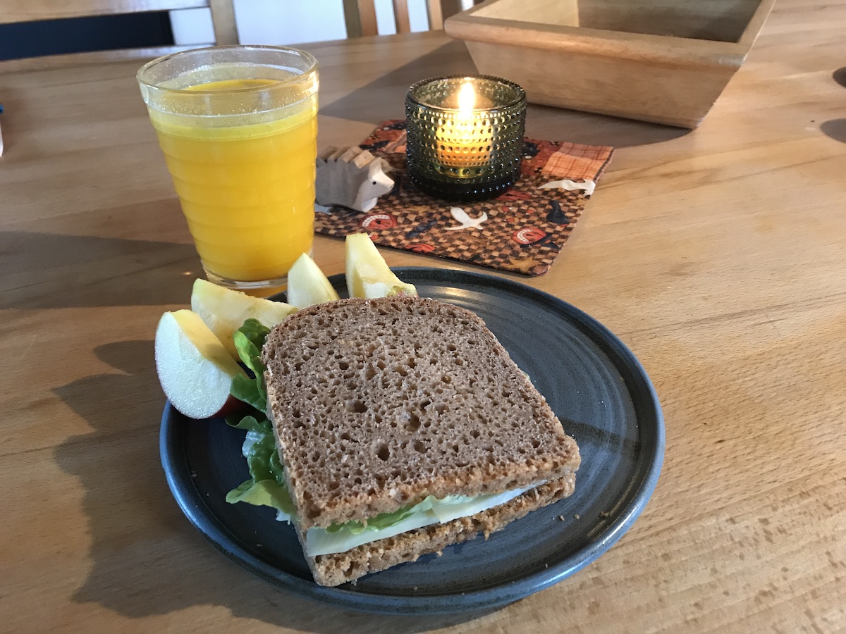 Ich bin motiviert aufgestanden, obwohl ich mich etwas verknautscht gefühlt habe. Die Schmerzen in meiner Hand am Morgen sind zwar besser geworden, seit ich beim Osteopathen war, aber eben nicht weg. Ich schreibe noch im Bett meine Morgenseiten. Nach dem Frühstück mache ich mir einen Ingwershot (aus Orangensaft, Zitronensaft, Honig und Ingwer). Der soll die anschleichende Erkältung fernhalten. Ich trinke über den Tag verteilt immer mal ein Schlückchen davon. Heute ist es grau, weshalb ich den Ofen anheize.