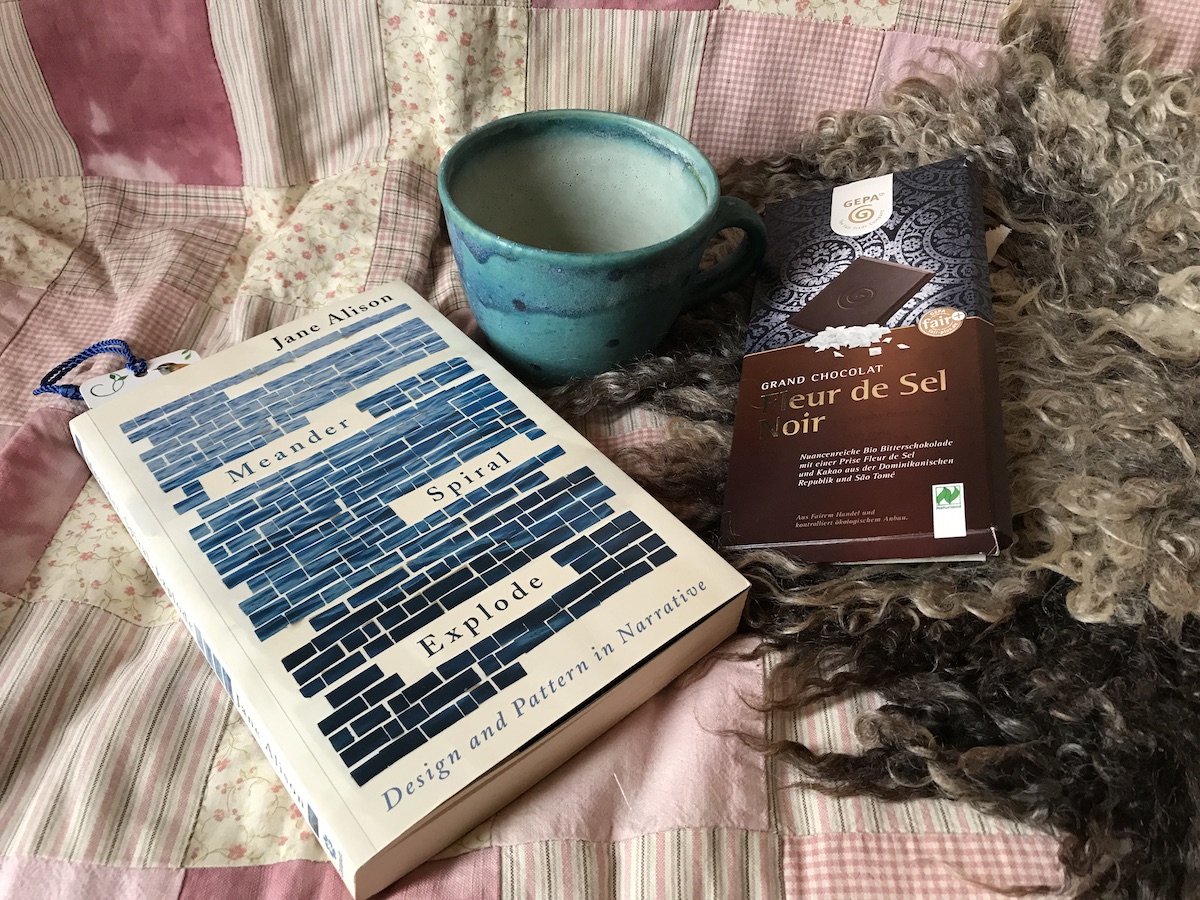 12 Seiten im Buch “Meander, Spiral, Explode – Design and Pattern in Narrative” von Jane Alison. Ich bin noch beim Vorwort, was allein 20 Seiten lang ist. Das hatte ich neulich schonmal zur Hand genommen, als ich auf meine Corona-Testung wartete. Ein Buch, was ich mir selbst nie gekauft hätte, aber eine Blogleserin hatte es doppelt, und hat es mir geschickt. Die Autorin geht Mustern in der Erzählung nach und fragt sich, ob es ausser dem klassischen Spannungsbogen noch andere Möglichkeiten gibt, Geschichten zu erzählen. Dazu beobachtet sie das Leben und die Natur.