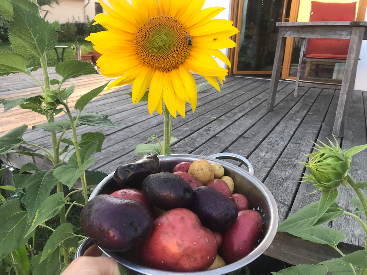 Im Garten habe ich nun viel zurückgeschnitten und rausgerissen. Zwischen den Erdbeerpflanzen wachsen ein paar wenige dünne Lauchstengel, die den Schneckenfraß überlebt haben. Ich habe die letzten Kartoffeln geernet und freue mich über die blühenden Sonnenblumen, die wir vor den Schnecken retten konnten, weil eine liebe Blogleserin Schneckenkragen für die Pflanzen per Post geschickt hat. Tausend Dank (eine persönliche Danke-Post kommt noch!).