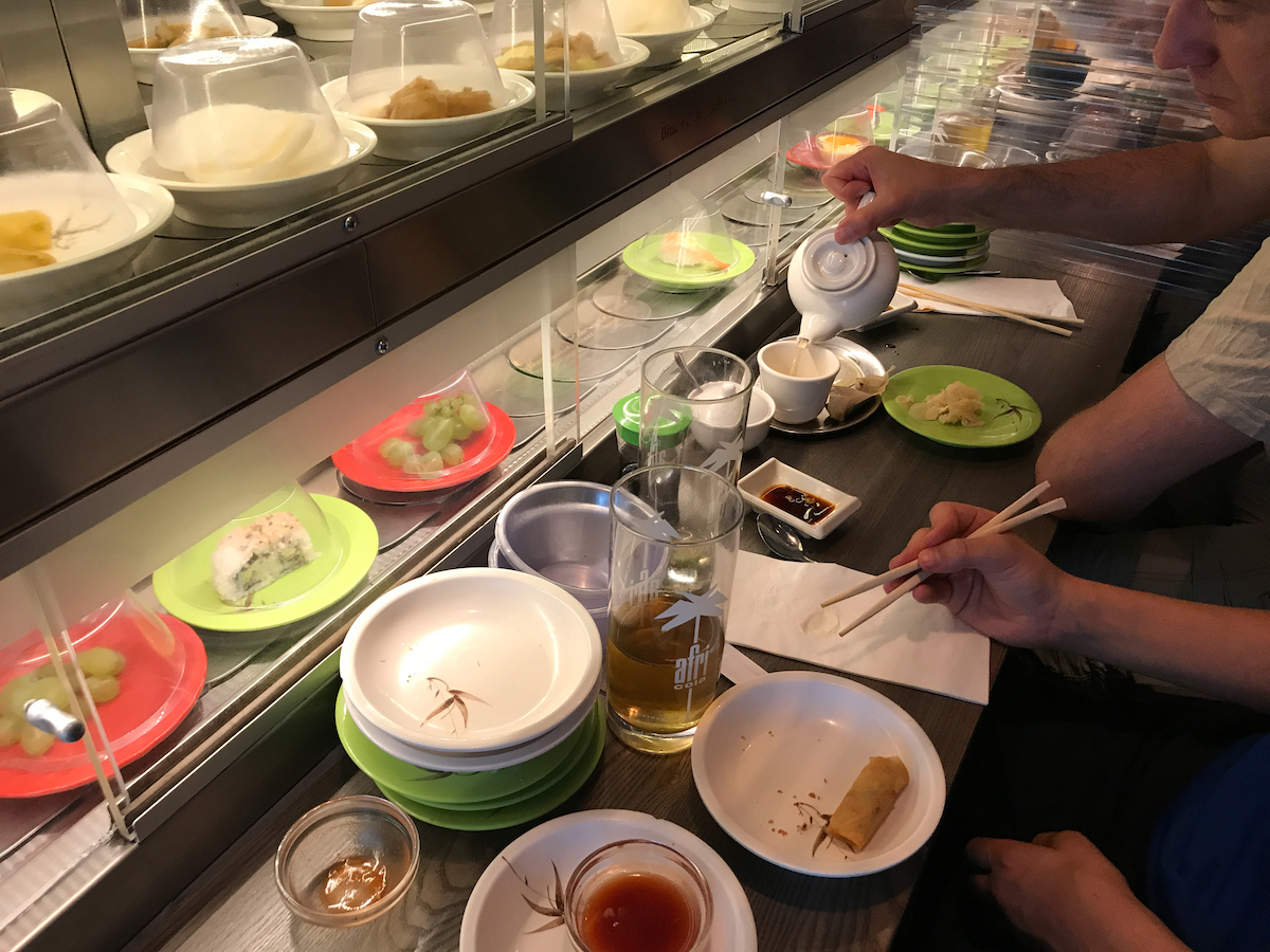 Bevor der Sterngucker nach Hause gekommen ist, waren wir mit dem Wolf noch zum Sushi essen. Er hatte sich gewünscht, mit uns beiden Essen zu gehen. Also waren wir beim Running Sushi in Rosenheim und haben uns am All-you-can-Eat-Buffet den Bauch vollgeschlagen. Das hat dem Wolf so richtig gut gefallen. Danach waren wir noch ein bisschen in der Stadt bummeln. Das war eher nicht so seins. Da wurde er dann bald ungeduldig.