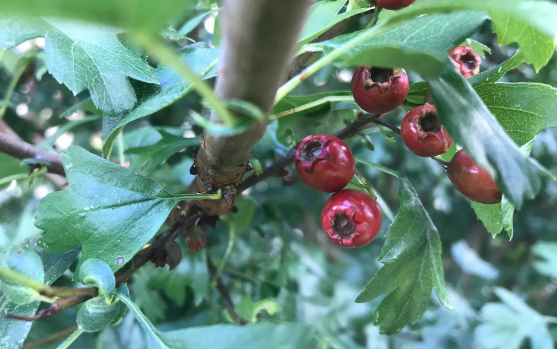 Ganz besonders aber freut mich mein Weißdorn, der langsam rote Beeren bekommt. Weißdorn ist mir seit dem Frauencamp 2016 eine Herzenspflanze geworden. Wenn ich in der Nähe bin, bekomme ich direkt eine kribbelige Aufregung und verspüre tiefe Zuneigung. Das fasziniert mich. Wie man in einen Baum verliebt sein kann. Auch die Brombeeren sind für mich solche Flüsterwesen, aber mit einer ganz anderen Energie.