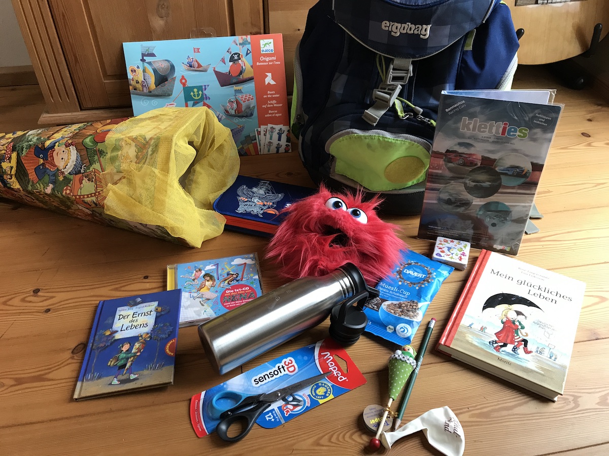 Im Laufe des Sommers habe ich den Inhalt für die Schultüte gesammelt. Kleinigkeiten aus dem Smukke Ting Laden in Merzhausen, eine neue Trinkflasche vom Globetrotter in Berlin. Die Linkshänderschere habe ich letzte Woche im Gerstaecker entdeckt (nach langer vergeblicher Suche jenseits von Kinderscheren), die Bücher (Der Ernst des Lebens* | Buch7 und Mein glückliches Leben* | Buch7) und 1×1 CD* hatte ich schon vor einer Weile bestellt (beides gebraucht). Die Handpuppe ist auch dieser Tage mit der Post angekommen. Das war ein Blitzeinfall. Ich wollte noch etwas für oben an die Schultüte dran, aber kein klassisches Kuscheltier. Weil Kuscheltiere hier eh nur rumliegen. Der Sterngucker steht aber gerade total auf Puppentheater. Also bekommt er jetzt eine Handpuppe, die ihr Maul bewegen kann. Die Figur hat er sich selbst ausgesucht, ohne zu wissen, dass er sie bekommt (wir haben die Website zusammen angeschaut). Ich hätte vermutlich eine andere Wahl getroffen. So glaube ich, dass die Schultüte doch einen tollen Start ins Schuljahr bereitet. Fehlt nur noch bisschen was Süßes rein, dann kann ich sie zubinden.