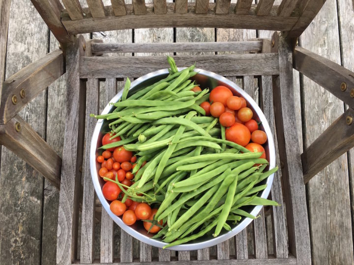 Ich richte derweil das Abendessen her (ein Salat aus Resten im Kühlschrank). Dazu esse ich schonmal die erwärmten Reste vom Mittag. Viel zu viel. Also trinke ich noch einen Diggestiv-Tee* hinterher. Meine Stimmung ist heute komisch. Sie schwankt ständig zwischen motiviert und gut drauf zu erschöpft, müde und weinerlich. Mir fällt auf, daß das Wetter heute auch so ist. Regen, dann wieder sonnig. Ich nutze das regenfrei und gehe in den Garten, eine Schüssel Bohnen ernten. Ich bin gespannt, wie lange uns der Garten noch so reich beschenkt.
