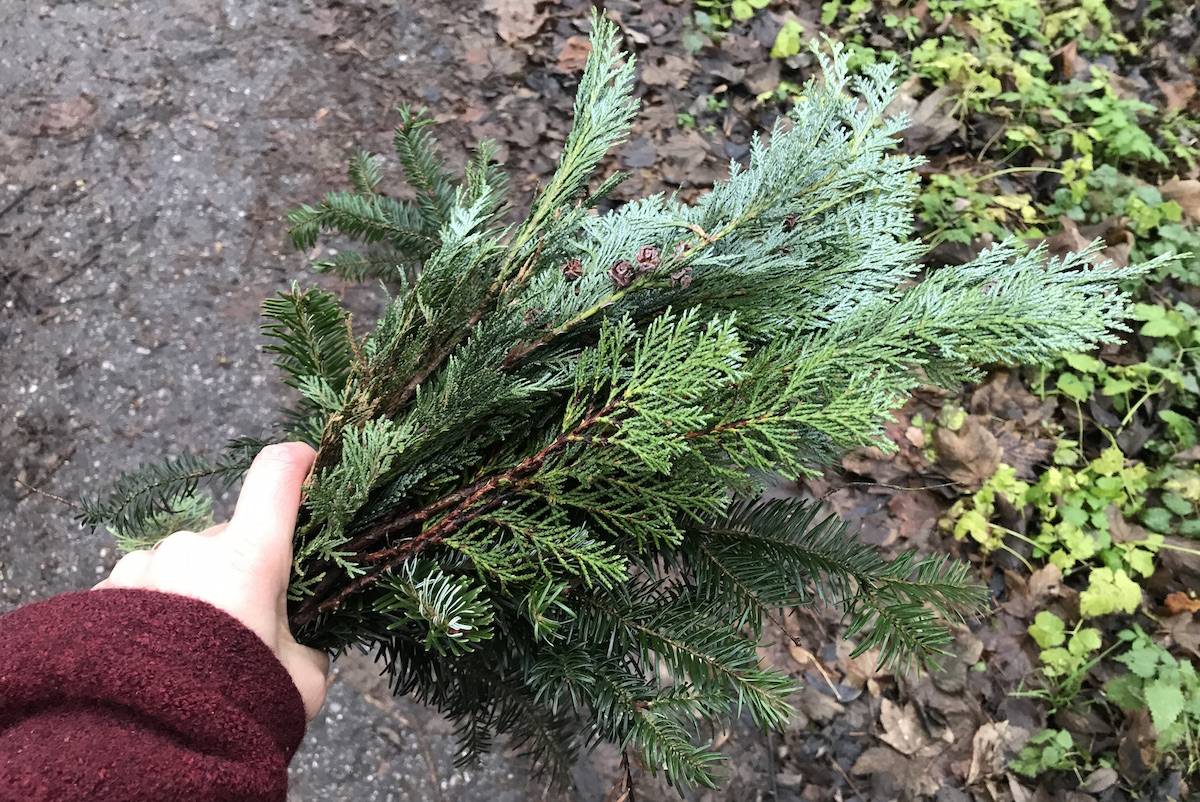 Am Nachmittag gönne ich mir einen kleinen Spaziergang. Ich finde grüne Zweige, die ich mir mitnehme, um daraus einen Kranz zu binden. Einige Zweige stelle ich in eine Vase. Hier ist es ein bisschen weihnachtlich geschmückt. Ausserdem habe ich Lust beim Michaelas Mustermittwoch mitzumachen und mache Skizzen von der Trompete des Wolfes, die hier rumsteht, weil er aktuell für den Auftritt an Weihnachten in der Kirche probt (ich hoffe, dieses Jahr kann er dabeisein. Letztes Jahr lag er ja leider an Heilig Abend mit Kotzeritis auf der Couch.)