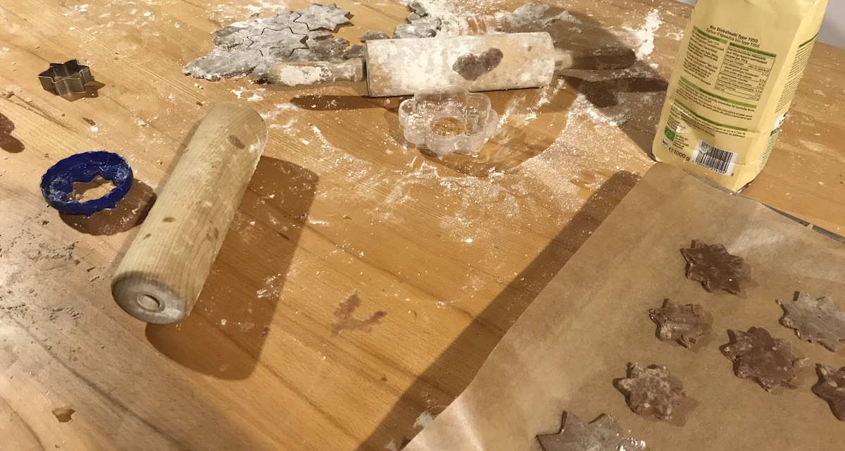 Nach dem Abendessen räumen wir den Küchentisch ab. Ich teile den Teig in vier Teile und überlasse den Kindern die Ausstechformen und Teigrollen. Die Tochter macht eine weihnachtliche Playlist an. Innerhalb von kurzer Zeit verwandelt sich die Küche pures Chaos aus Mehl, Teigresten und Kindergeschrei. Da war er wieder, der Grund, warum ich Plätzchenbacken für eine romantische Weihnachtsillusion halte. Ich frage mich, ob ich was falsch mache oder ob es an meinem generellen Anti-Back-Mindset liegt.