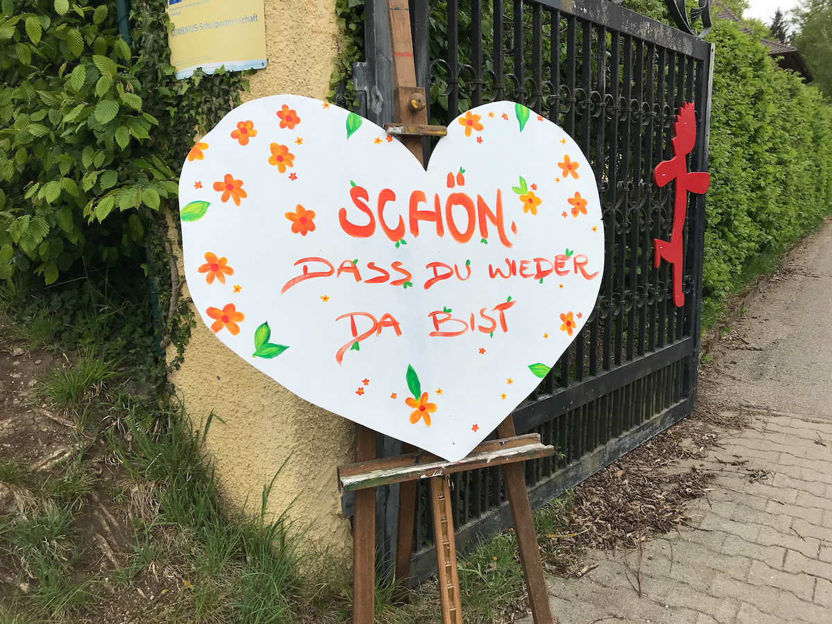 Das war das zweite oder dritte Mal, dass ich innerhalb der letzten 6 Wochen mal draussen in der “Welt” war und das erste Mal mit Maske unterwegs. Aber es war toll, wieder in der Schule zu sein. Schon beim Befahren des Parkplatzes habe ich gemerkt, was es doch für ein Herzensort für mich geworden ist. Da war eine schöne Stimmung, die Prüfungsklassen waren da, in zwei Gruppen geteilt und hatten gerade Pause. Mit Abstandsregeln kann man übrigens gut Federball miteinander spielen. Ich habe mich über vertraute Gesichter gefreut und Willkommens- und Wertschätzungsbotschaften (Im Schulgebäude ein Korb mit tollen Nascherein gefüllt und einem Dank an das Lehrer- und Verwaltungsteam für ihre Arbeit in dieser sehr speziellen Zeit) auf dem Schulgelände. Das hat mich sehr berührt.