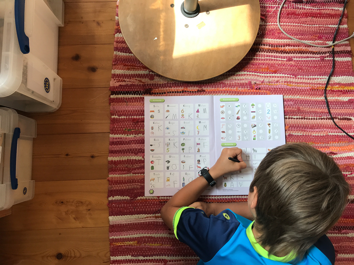 Der Sterngucker erhält am Wochenanfang eine persönliche Email mit Ideen, wo er sich auswählen kann, was er tun möchte. Da ist Kunst, Deutsch, Mathe und Kosmische Erziehung dabei (“Aufgabe der kosmischen Erziehung als Fach ist es, dem Kind eine Vorstellung vom Zusammenspiel der Teile der Natur untereinander und mit dem Menschen zu vermitteln. Die wichtigsten Ziele sind Achtung vor und Verantwortung für die Natur und die vom Menschen geschaffene Kultur. ” Quelle). Weil er sein Buchstabenheft fertig hatte, sind wir zur Schule gefahren und haben ein neues Arbeitsheft zum Selbstlernen abgeholt.