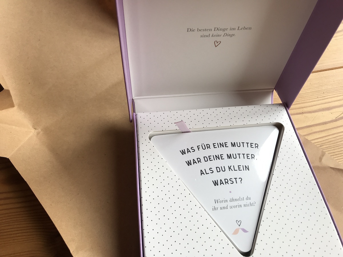Beim Fragen-stellen soll das Kartenset Herzensfragen ein bisschen Nachhelfen. Fünfzig Fragen für interessante Gespräche kommen auf dreickigen Karten im ansprechenden Geschenkkarton daher. Dann kann das Gespräch losgehen: Welchen Ratschlag deiner Mutter oder deines Vaters hast du nie vergessen? Hälst du dich heute noch daran?, Wie warst du als Jugendliche? Hast du eine wilde Zeit gehabt? usw.