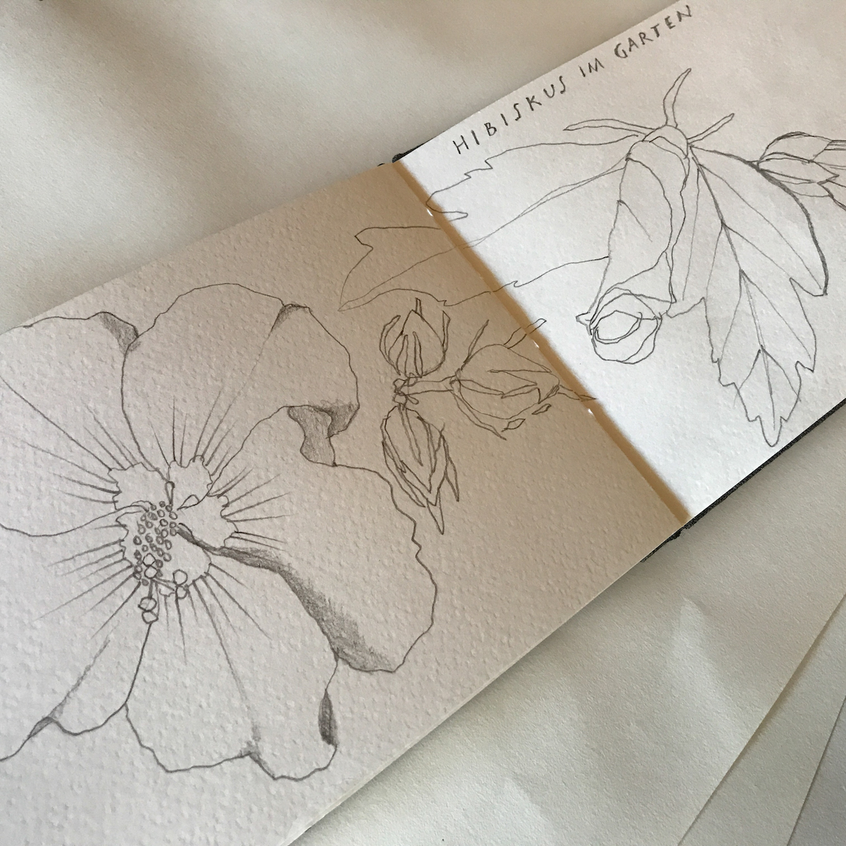 Eine der August Art Journal Wochenaufgabe war es, eine Pflanze zu wählen, sie jeden Tag zu besuchen, zu beobachten und zu zeichnen. Ich besuche den Hibiskus.Das August Art Journal macht mir Freude. Jeden Tag drehe ich ein kleines Video, lade es zu youtube hoch und versende eine Email an die Teilnehmerinnen. Und freue mich darüber, was mitgemacht und geteilt wird, wie sich Freude ausbreitet und die Teilnehmerinnen ebenso viel Spaß haben wie ich. Das ist schön.