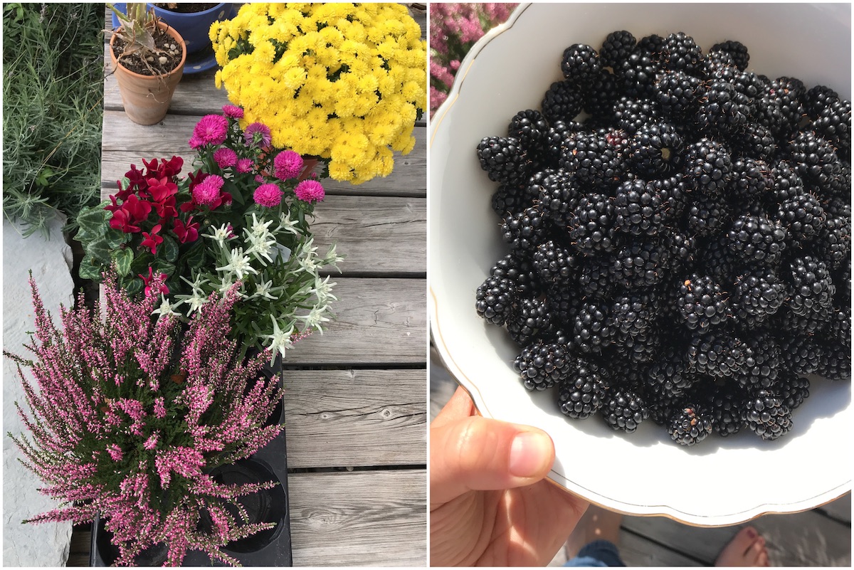 Ich habe den ganzen Lavendel zurückgeschnitten und viel Unkraut gerupft. Der Nachbar hat mir über den Zaun einen Salatkopf und Tomaten geschenkt. Nicht im Bild sind die vielen Himbeeren und Brombeeren, die ich jeden Tag vom Strauch direkt in den Mund esse. Hm. Im Baumarkt konnte ich nicht vorbeigehen an den Blumen für meinen Kasten auf der kleinen Büroterrasse. Da waren zuerst die Tomaten drin. Die sind nun abgeerntet. Jetzt sieht es schon etwas herbstlich aus. Ich sehe zum ersten Mal Edelweiss, Aus irgendeinem Grund lässt mich das an meinen Opa denken. Edelweiss und Enzian. Ich weiss gar nicht warum. Ich bin nicht in alpinen Gegenden groß geworden und habe in meiner Kindheit eher Urlaub an der Ostsee als in den Bergen gemacht.