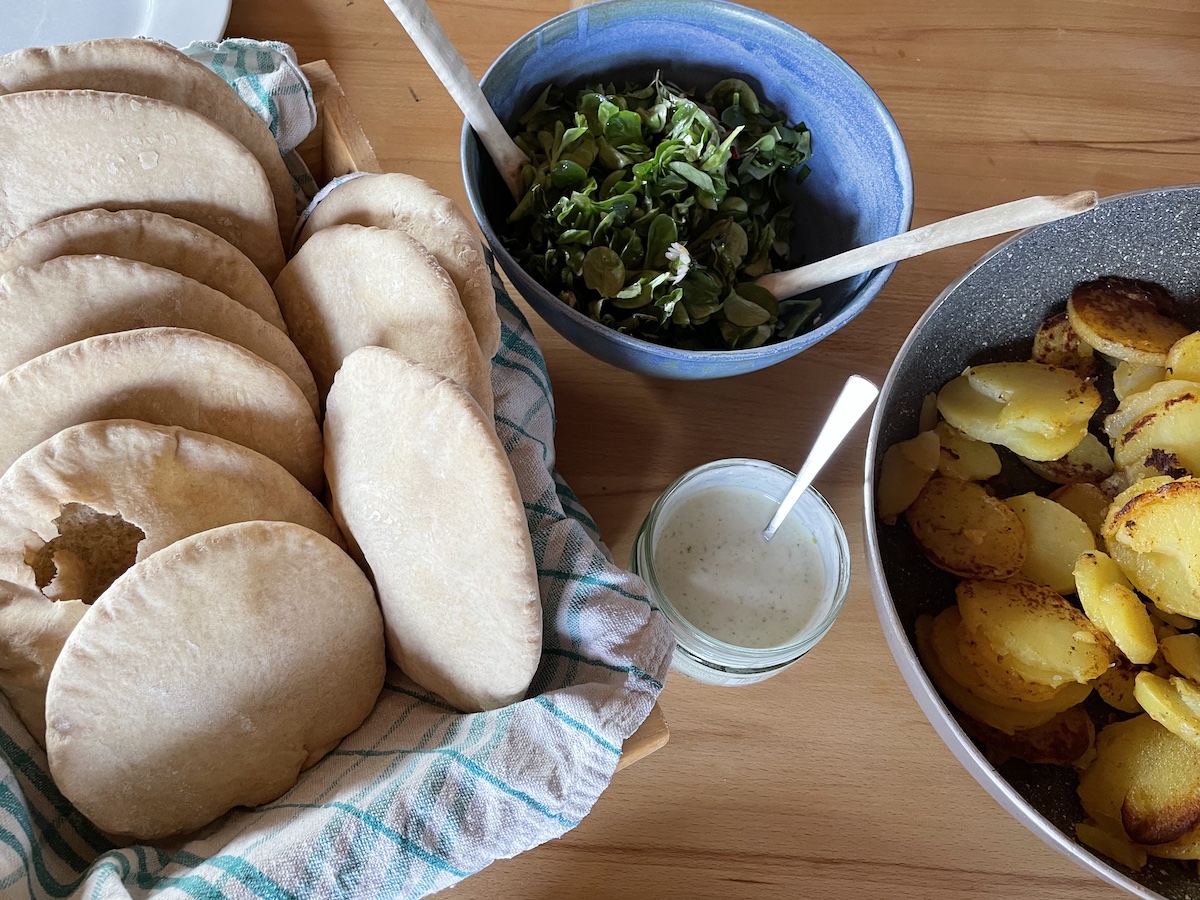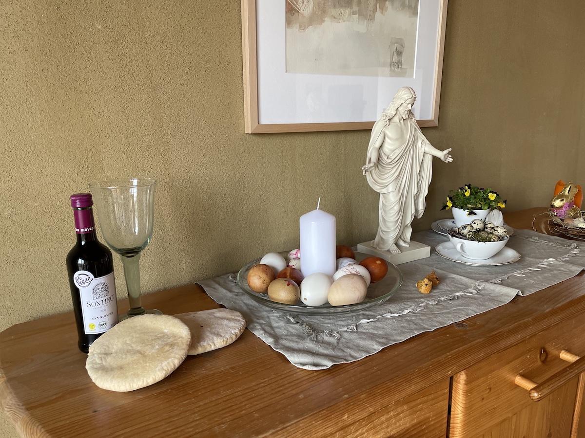 Am Gründonnerstag habe ich Pita Brote nach dem Rezept von Veronika Smoor gebacken. Der Mann hatte mir einen kleinen Rotwein mitgebracht. Während er zum Arbeiten im Lanserhof war, habe ich gemütlich mit den Kindern zu Abend gegessen und für mich selbst Abendmahl gefeiert.