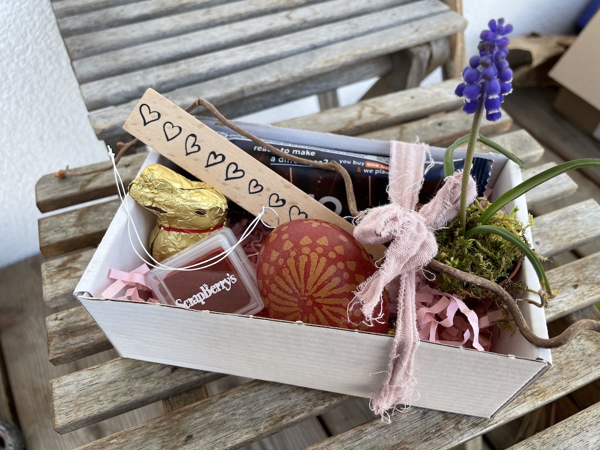 Am Nachmittag gingen wir spazieren, wie jeden Tag. Die Tochter und ihr Freund haben geholfen, die Osternestchen zu verstecken. Die Suche war unterhaltsam und zum Teil herausfordernd. Alle Kinder haben aber ihre Geschenke gefunden: Süßkram, Chips und etwas kleines zum Spielen (Tischtennisschläger und einen Taschenfrisbee).