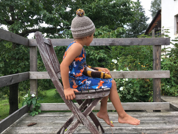 Was für ein schönes Wollgeschenk! Und du hast schöne Mützen daraus gehäkelt. Das Kleid deines Sohnes habe ich auf den letzten Fotos schon bewundert. Der Stoff ist so schön und ich finde es klasse, dass er Kleid trägt. Wie kam er dazu? Als mein Sohn letzten Sommer mit “Mama, nähst du mir auch mal ein Kleid?” um die Ecke kam, habe ich das sofort gemacht. Hätte ich geahnt, dass er sein Kleid so gerne trägt, hätte ich einen ordentlichen Stoff genommen. So ist es aus einem aussortierten Shirt vom Papa und wird trotzdem oft getragen.
