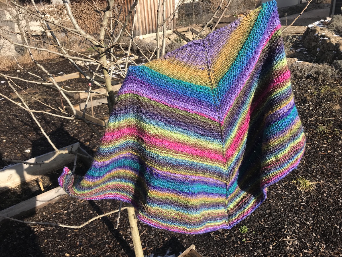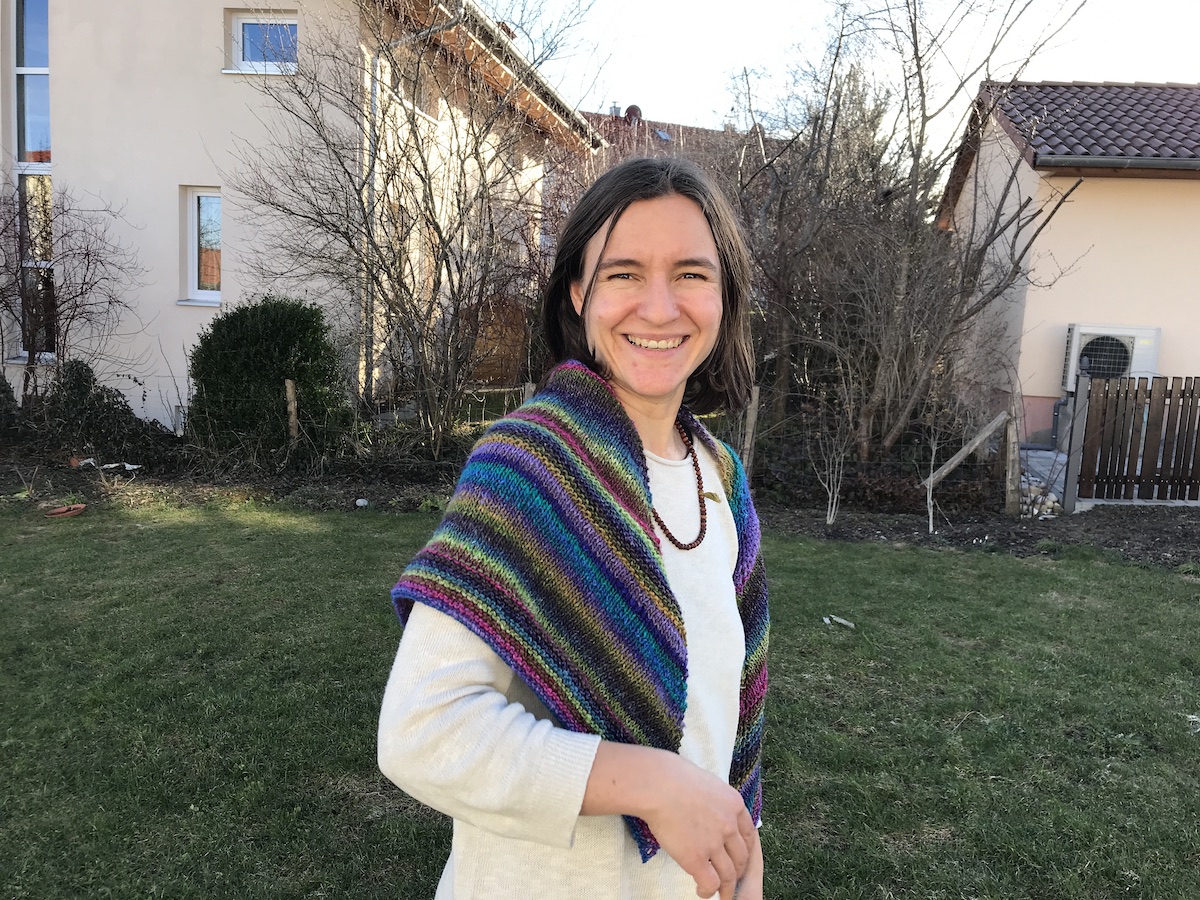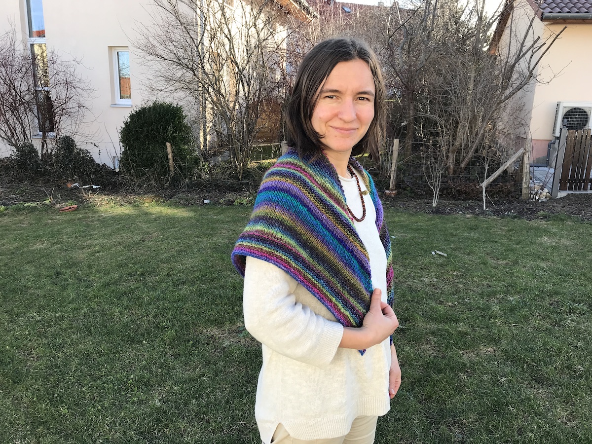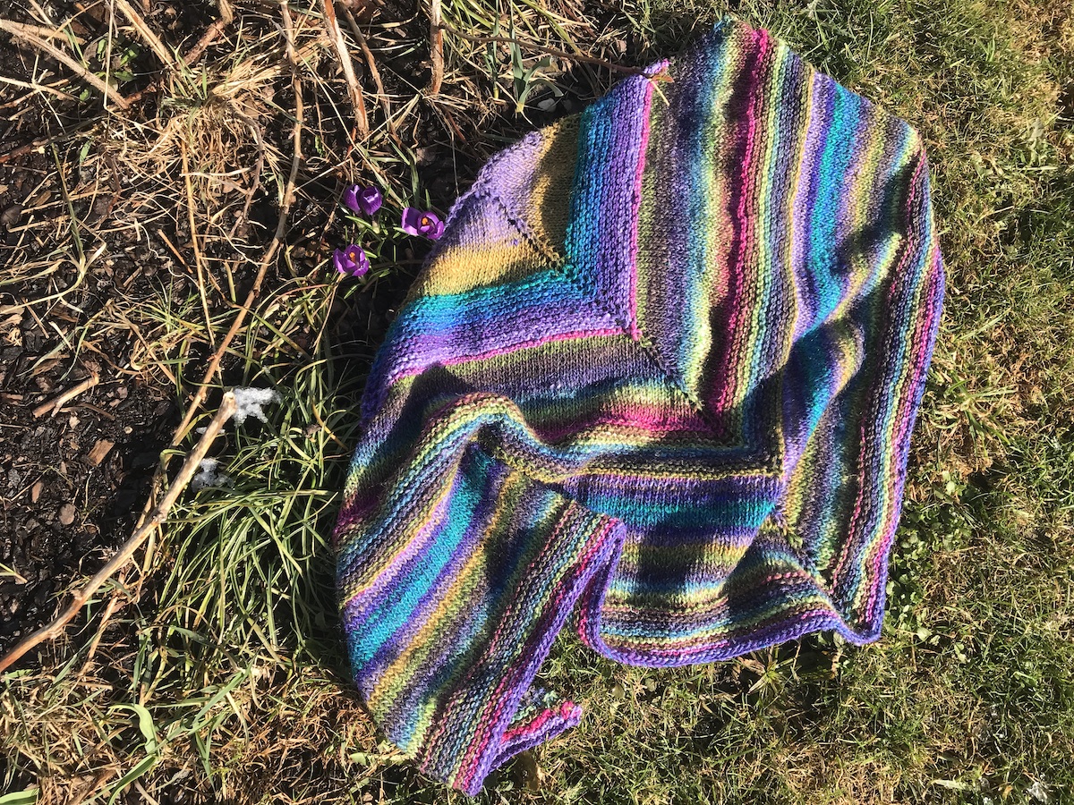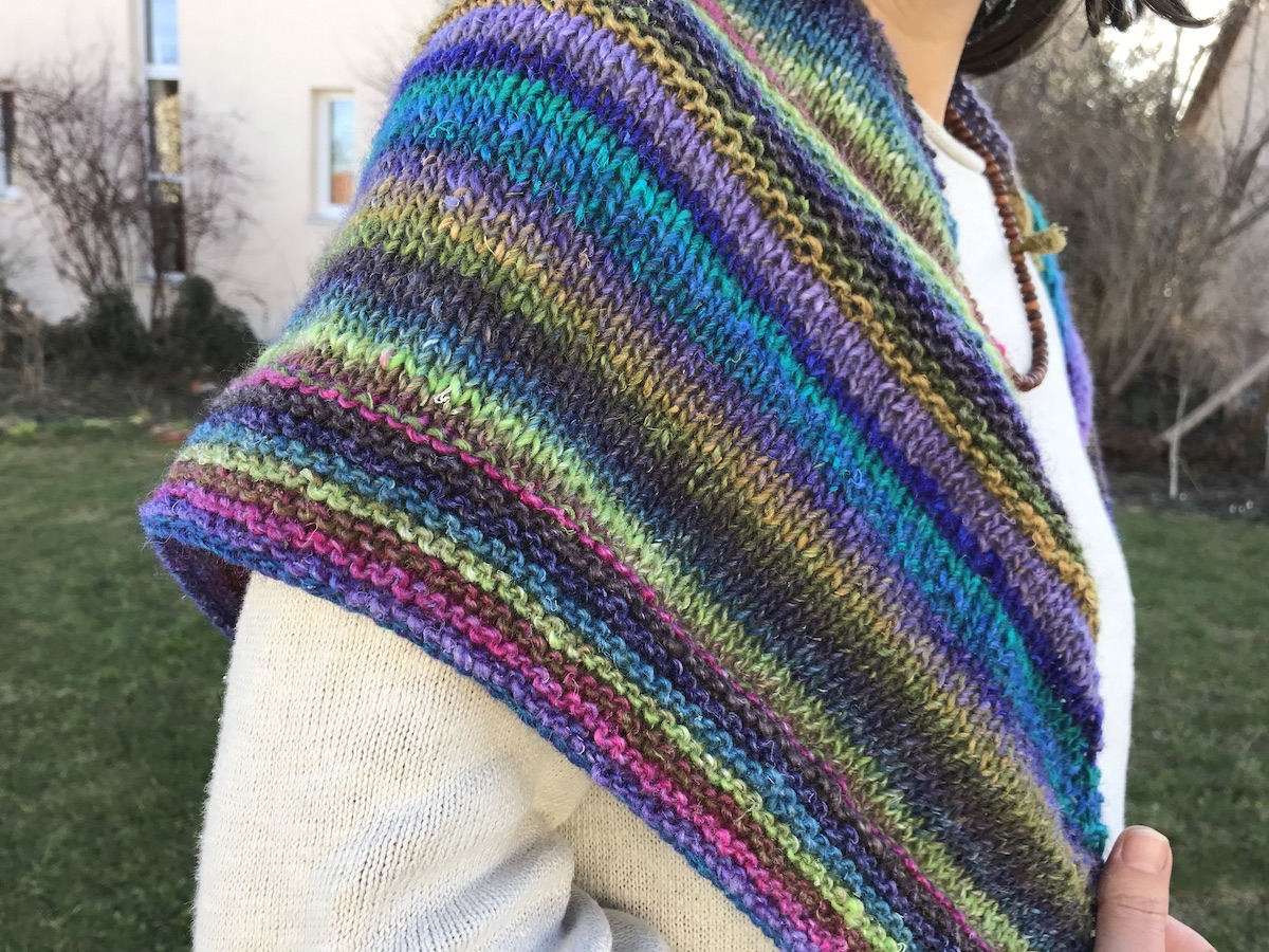 Meine Wahl fiel auf den Simple yet effective shawl von Laura Chau. Den strickte ich in einer frühlingsbunten Noro Wolle (Noro Silk Garden) aus meinem Stash. Mit zunehmender Breite der Reihen veränderte sich auch die Verteilunng der Farben/Breite der Streifen. Für das Tuch verbrauchte ich etwas mehr als 200 g. Das war ein schnelles Strickstück für Zwischendrin und hat mir echt Spaß gemacht.