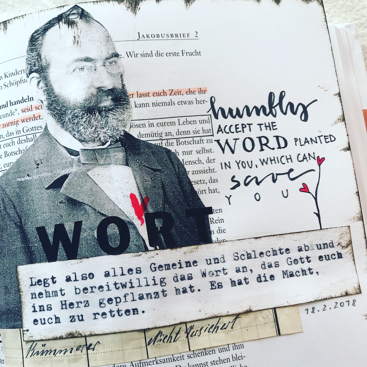Meine Aufwachstimmung ist heller. Mit etwas Restgrummeligkeit frühstücke ich und ziehe mich in mein Büro zurück. Um zu mir selbst zurückzufinden ist Malen, Zeichnen und Schreiben der direkteste Weg. Ich kritzele und klebe also in meiner Artjournaling-Bibel* zum Bibelspruch des gestrigen Fastentages. Ich möchte nach dem Mittagessen gern rausgehen und einen Spaziergang machen. Spazieren hilft auch, sich wieder zu regulieren. Die liebe Frau Nachbarin klingelt, verspricht uns Kuchen und fragt, ob wir nach dem Mittag Lust auf einen Winterspaziergang haben. Oh ja!