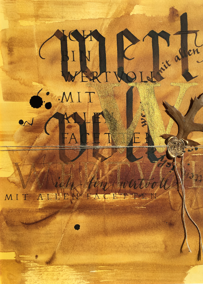 Nach einem unserer Coaching Telefonate fragte Jana mich, ob ich die Essenz unseres Gespräch als Kalligrafie festhalten könnte. Meinen Satz einmal schreiben. Ich willigte ein. Und dann begannen die Bilder in mir zu arbeiten. Das goldene Braun eines Herbstwaldes, was ich gesehen und gespürt hatte, das warme Gefühl und die Botschaft aus meinem tiefsten Inneren, meinen kleinen Saboteuren zum Trotz: “Ich bin wertvoll mit allen Facetten”