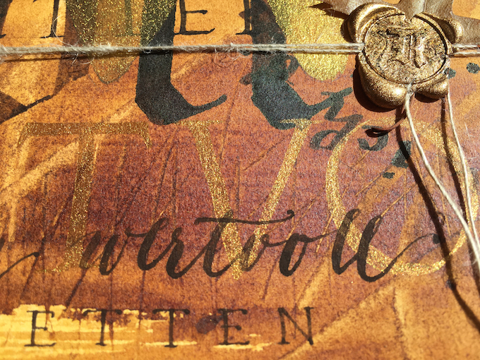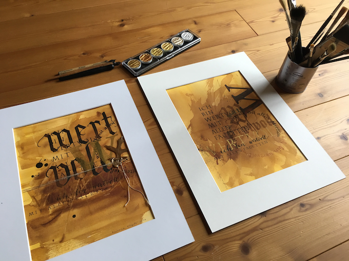 Zuerst habe ich die Aquarellpapiere auf eine Holzplatte gespannt. Die Blätter habe ich dann mit leuchtend gelber Aquarellfarbe eingefärbt (Stockmar & Schmincke), dann mit Airbrushfarbe (Schmincke Aero Color brazil brown) drauf herumgepinselt. Dadurch ist das golden leuchtende Braun entstanden. Die verschiedenen Textschichten sind dann mit Guache, Fine Tec Goldfarben und Beize in Walnuss aufgetragen.