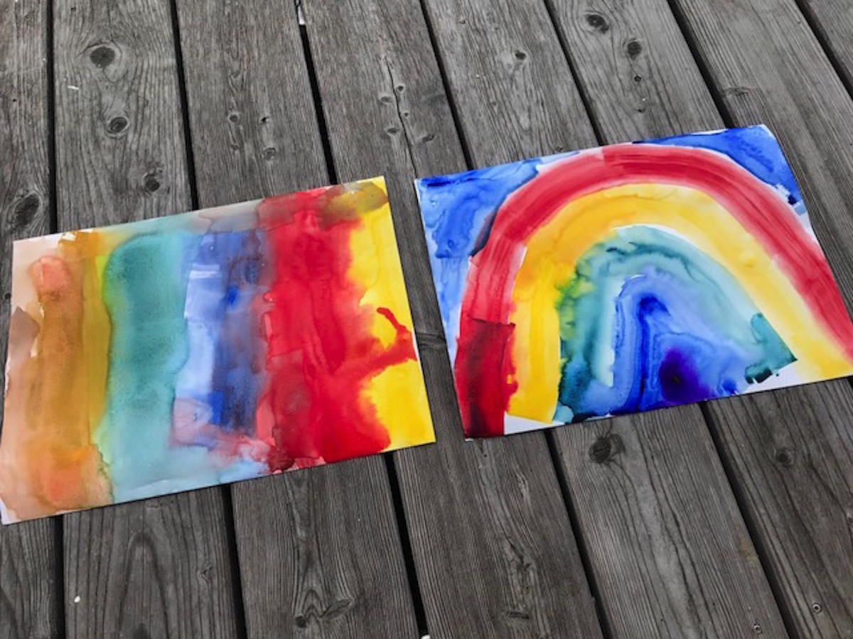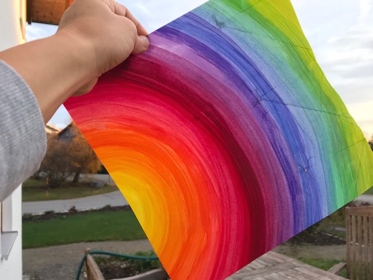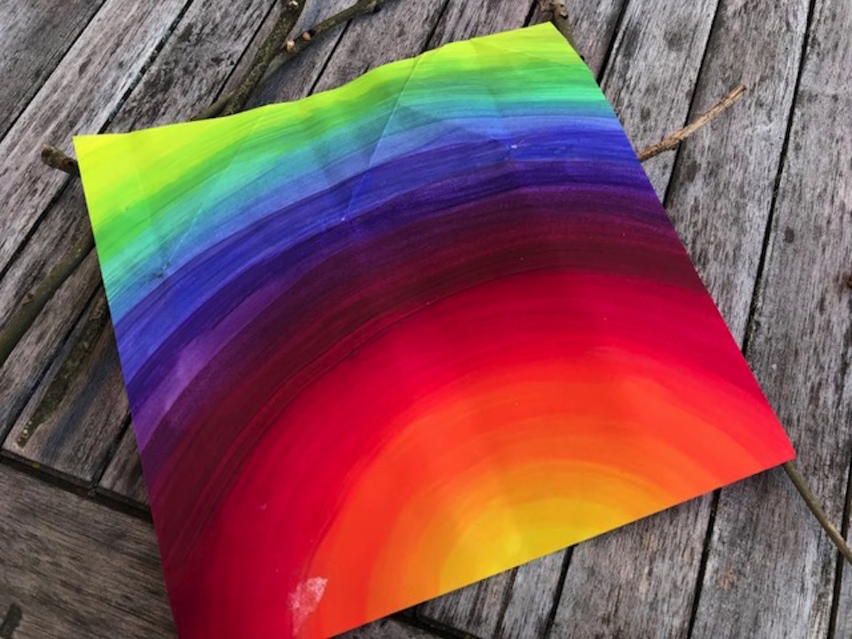 Also schnitt ich das Papier in zwei Quadrate. Ölte es mit Leinöl (ein anderes war gerade nicht im Haus), damit es schön durchsichtig wird und faltete nach dieser Anleitung zwei regenbogenbunte Laternen. Die waren so hübsch anzusehen, dass die Kinder unbedingt auch Papier anmalen und daraus Papiere falten wollten.