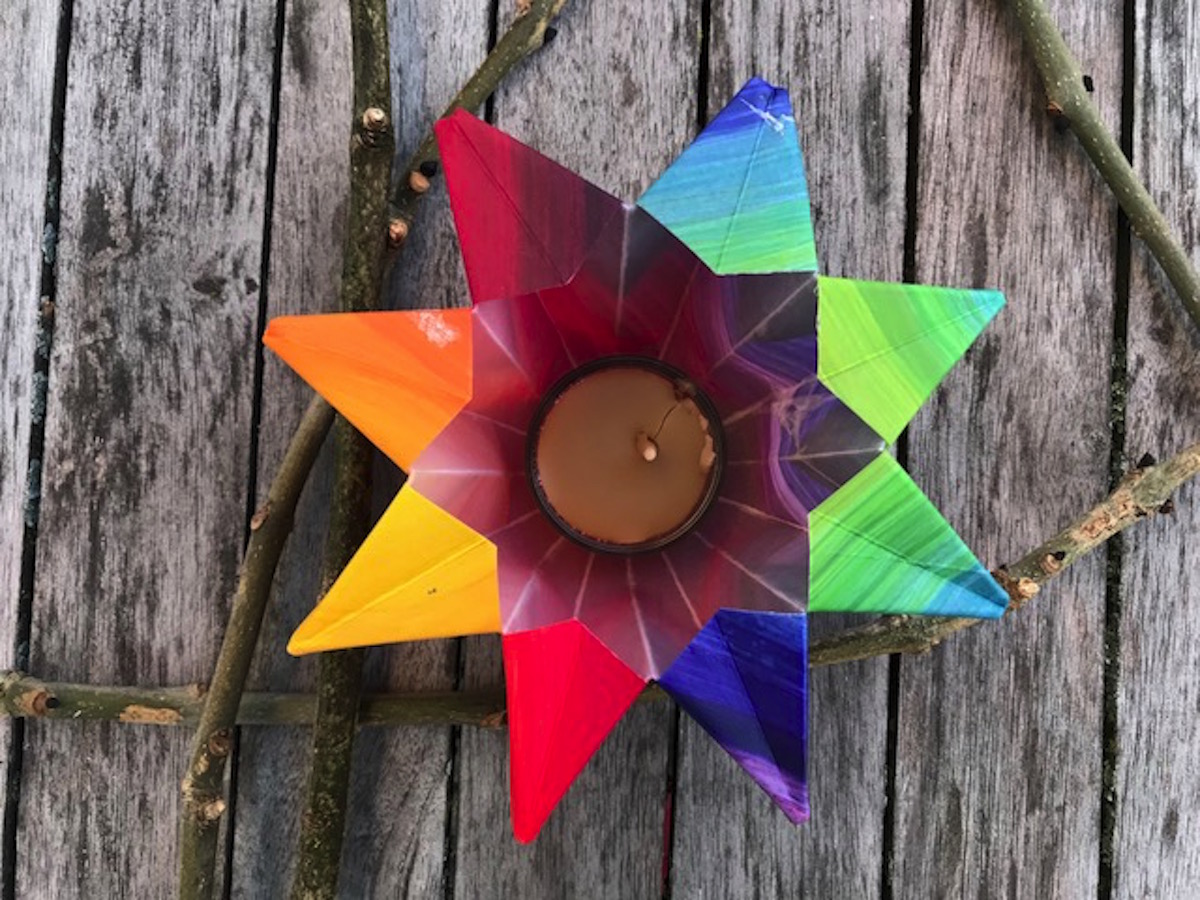 Zu meinem Geburtstag kam bei mir ein regenbogenbuntes Packerl an. Die Tochter erkannte sofort, dass das von Jana sein musste (war es auch). Ich bin ja eine Verpackungsaufheberin und -wiederverwenderin. Also weickelte ich das Packerl vorsichtig aus, erfreute mich sehr am Inhalt und bewahrte das Papier auf. Am Wochenende kam mir in den Sinn, dass ich daraus ja so eine Waldorflaterne falten könnte.