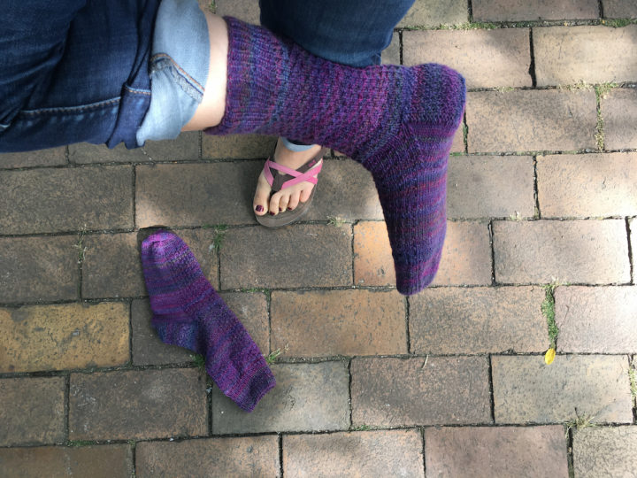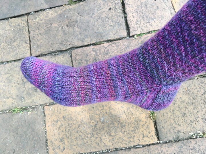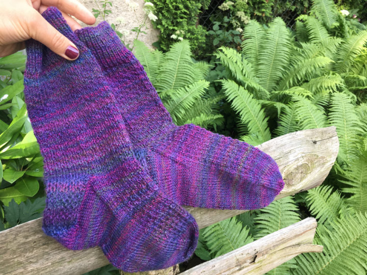 Diesmal hatte ich mich an Hermines Alltagssocken gewagt, ein Muster von Erica Lueder, was ich bei Micha entdeckt habe. Sockenwolle gibt es genug in meinem Stash. So entstand auf mehreren Bahnfahrten ein Paar Socken in einer Beere-Augbergine Mischung. Ich mag das Muster sehr. Es ist einfach, unspektakulär, aber wirkungsvoll. Zusammen mit dem rafinierten Fersenmuster mal eine andere Art, Socken zu stricken. Bei Ferse und Spitze musste ich auf die Anleitung schauen, ansonsten konnte ich das Muster nach einer Weile gut auswändig.