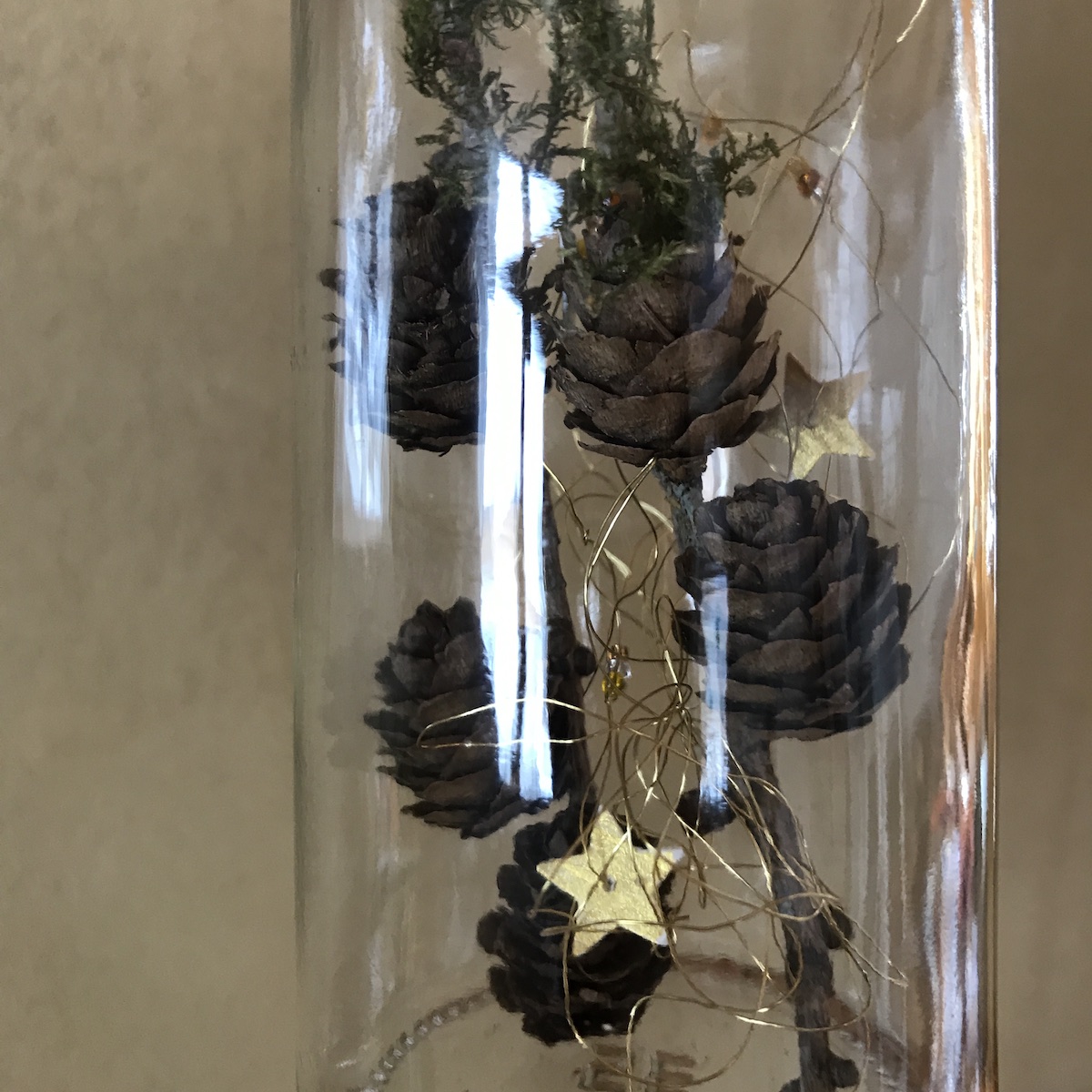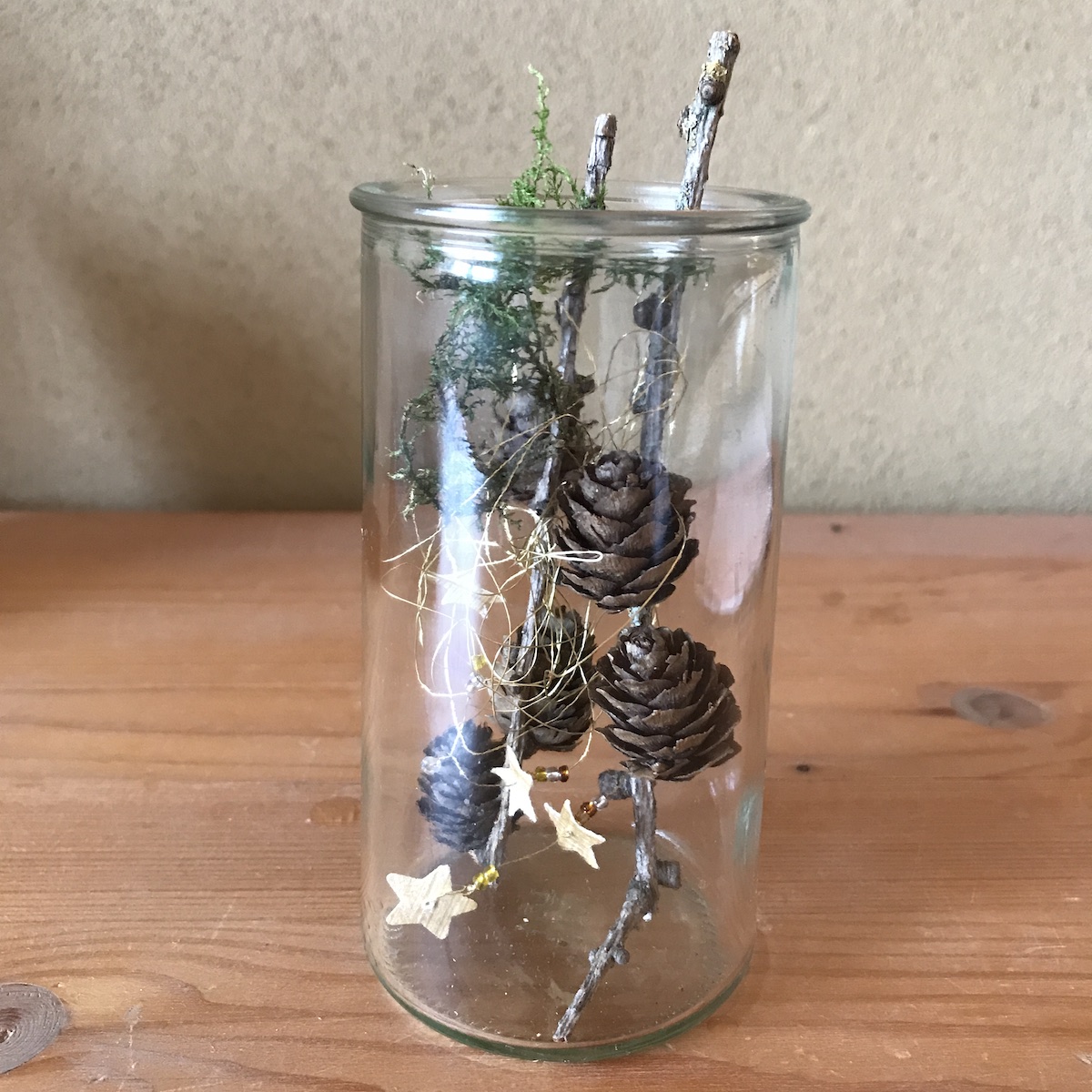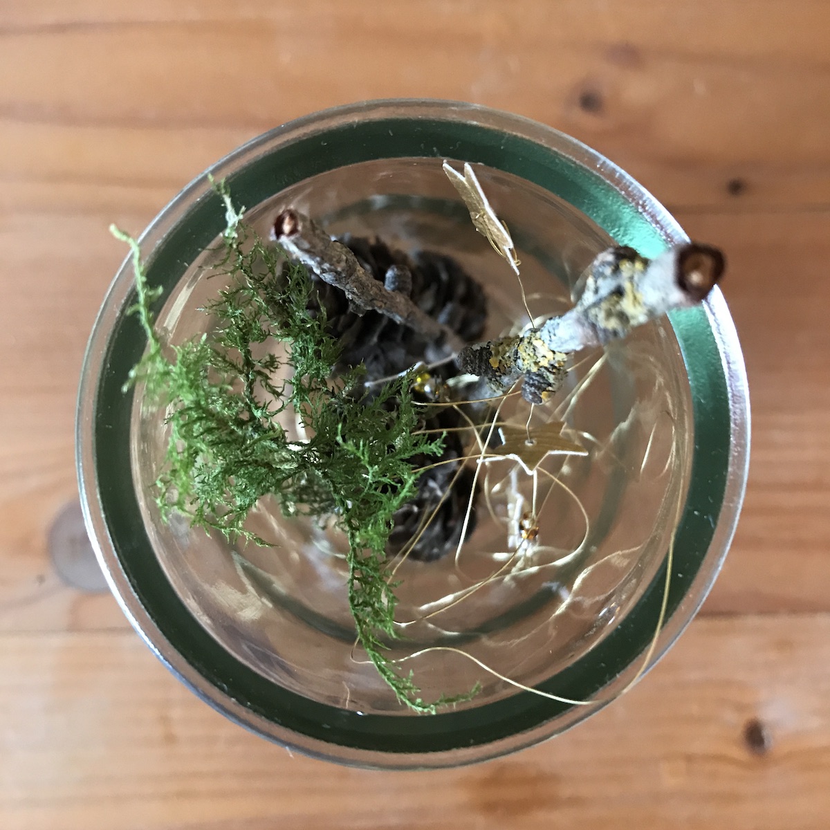 Weiter geht es ganz einfach. Die Zweige, das Moos und den Draht in das Glas stopfen. Vielleich hier und da noch ein bisschen herumzuppeln und es in From ruckeln.