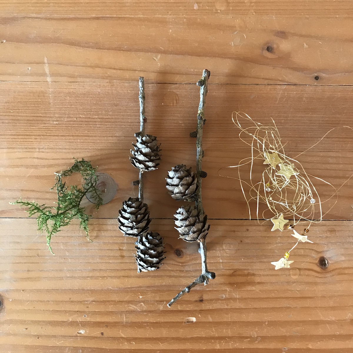 Von meinem letzten Spaziergang brachte ich ein Stück Moos mit, in meiner Bastelkiste fanden sich noch Lärchenzweige (notfalls hätte es die auch am Baum gegenüber gegeben). Die goldenen Sterne und der Draht sind von einer Geschenkverpackung. Das Glas ist ein Senfglas (vom Aldi?), was als Saftglas oder jetzt als Deko weiterleben darf.