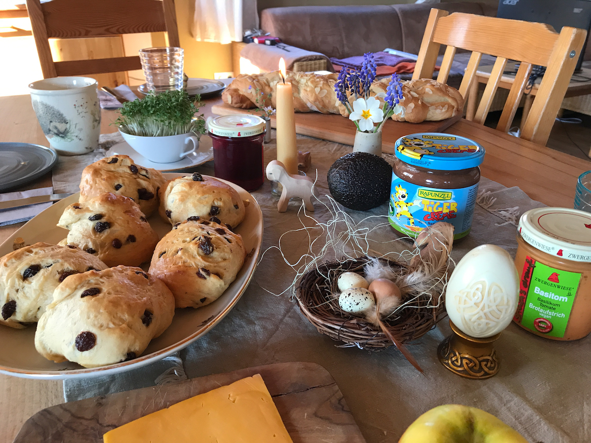 Am Abend backt die Tochter einen Hefezopf und Rosinenbrötchen für unser Osterfrühstück. Ich bereite die Osternester vor und decke am Abend schon den Frühstückstisch.