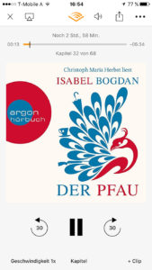 Als erstes lud ich mir “Der Pfau” von Isabel Bodgan* runter. Darüber hatte ich online schon viel gelesen. Das Buch stand eh auf meiner Leseliste. Während unseres Aufenthalts in Tirol hatte ich genug Zeit, in Ruhe das Hörbuch zu hören. In der Saunapause oder auf dem Rad im Fitnessraum. Ich fand die Geschehnisse um den verrückt gewordenen Pfau unterhaltsam und leicht verdaulich. Genau wonach ich für so ein Hörbuch gesucht hatte. Die Geschichte der Banker, die ein Wochenende in der schottischen Pampa zum Teambuilding verbringen und dann eingeschneit werden, ist spannend und kurzweilig. Ich mochte die sympatischen Charaktere, den Humor und die ausführlichen Situationsbeschreibungen.