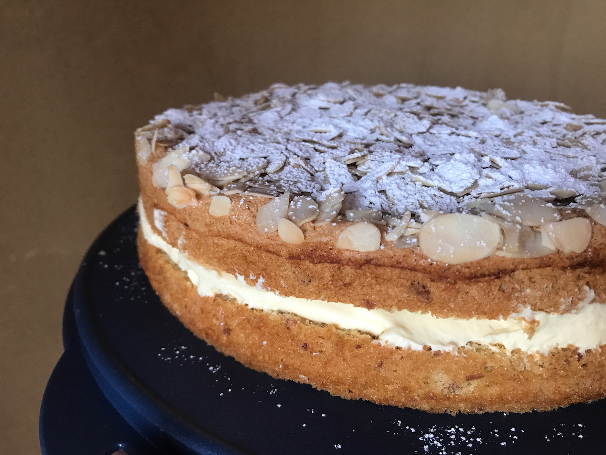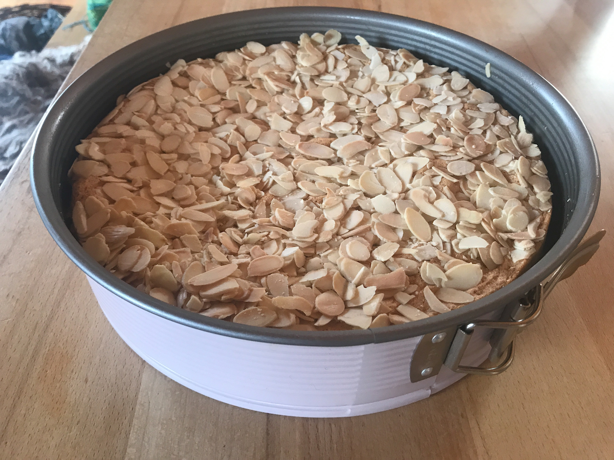 2. Mehl mit Backpulver mischen, sieben und portionsweise mit einem großen Schneebesen gleichmässig unterheben. Die gemahlenen Mandeln zugeben und ebenfalls unterheben. Den Teig in eine Springform (Durchmesser 26 cm, Boden gefettet oder mit Backpapier belegt) geben, die gehobelten Mandeln darauf verteilen. Die Form auf dem Rost in den Backofen schieben. Etwa 30 min backen. Die Oberfläche soll ein bisschen knistern, wenn man mit den Fingern draufdrückt. Dann ist der Teig fertig gebacken.