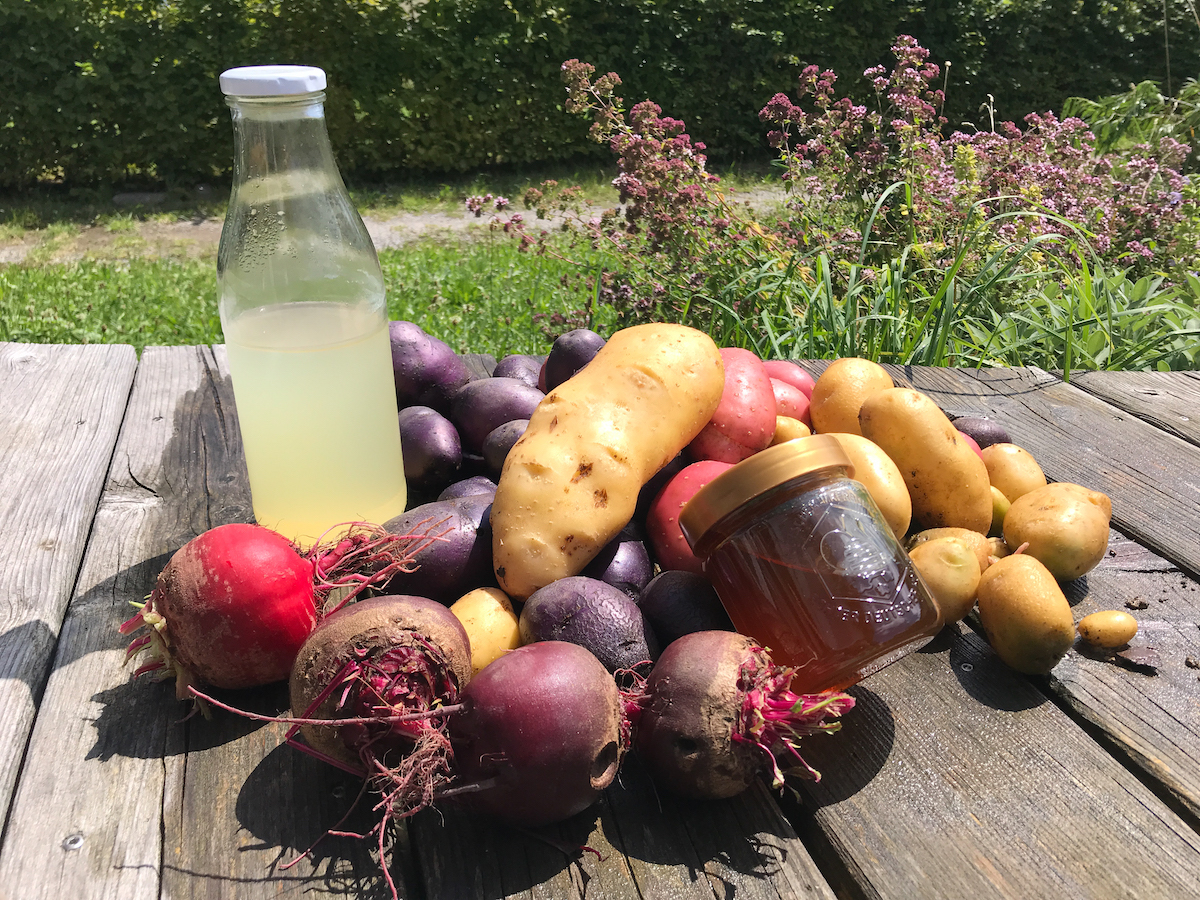 Aus den ersten Klaräpfeln vom Apfelbaum einer Freundin habe ich Apfelessig hergestellt. Von den Bienen meiner Schwester habe ich Honig. Das Hochbeet der Tochter schenkt uns Rote Beete, wovon ich schon einige eingelegt habe. Mein minikleiner Kartoffelacker birgt tollste Kartoffeln. Ausserdem gibt es eine kleine Bohnenernte, Himbeeren, Tomaten und Kräuter. Alles bescheiden in diesem Jahr, aber umso kostbarer.