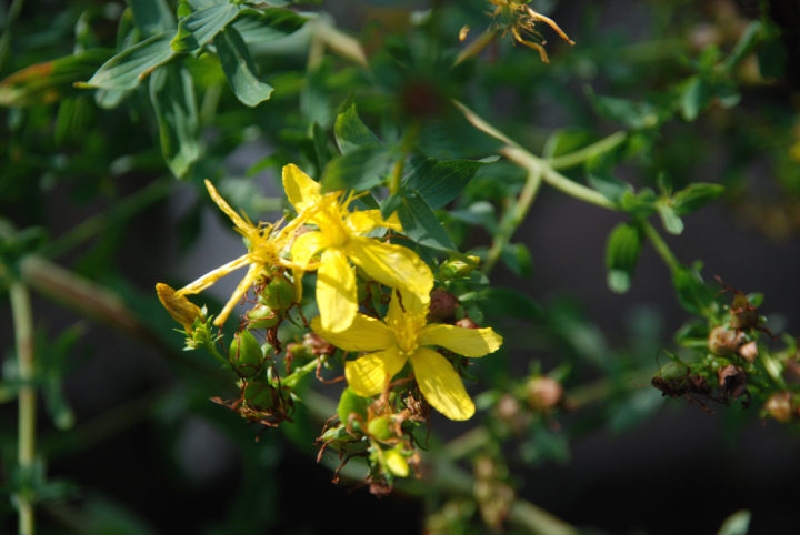 Das Johanniskrautöl habe ich schon lange gemacht, das hat pünktlich bei mir im Garten um Johanni geblüht. Mein Johanniskraut im Garten hat nach dem Abschneiden noch mal später geblüht. Ich mörsere die Blüten und das Öl ist dann nach 2 Wochen fertig und schön dunkelrot.