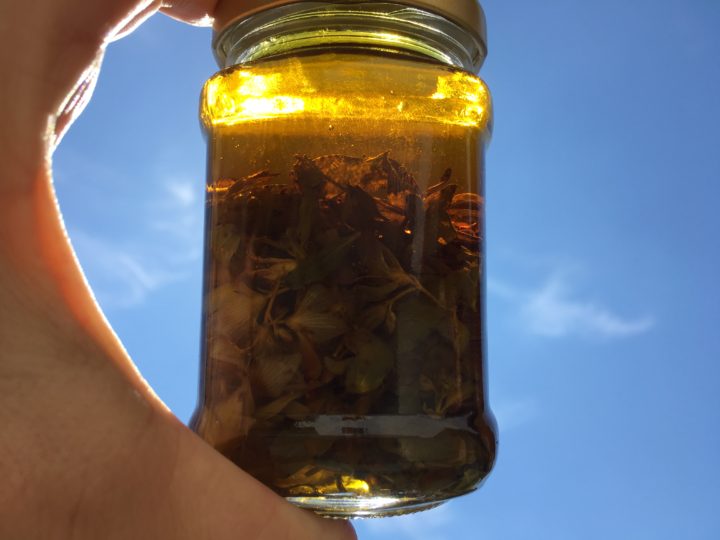 Ich recherchierte kurz im Internet, wie ich Johanniskrautöl herstellen kann. Das ist sehr einfach. Du pflückst eine Hand voll Blüten und feine Blätter, befreist sie vom Stiel und platzierst das ganze locker in einem Glas. Nun musst du das ganze nur noch mit einem guten Olivenöl übergiessen, verschliessen und für 6 Wochen in die Sonne stellen.