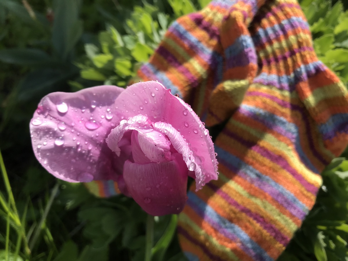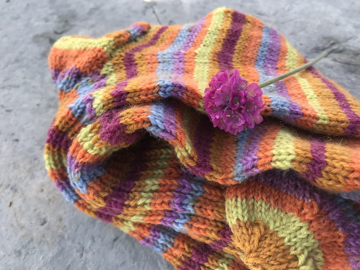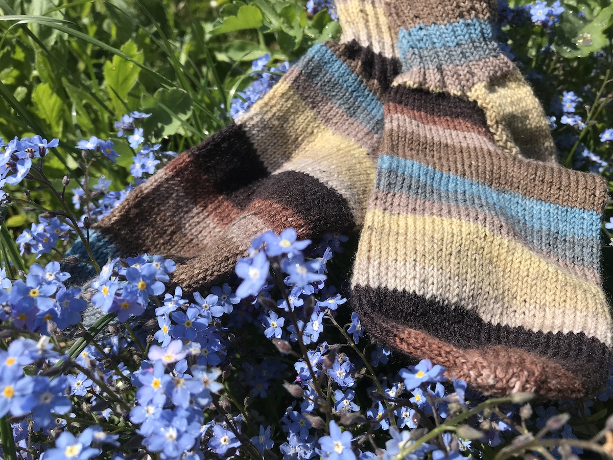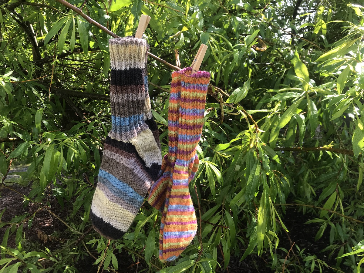 So sind in den letzten Wochen zwei Paar Socken fertig geworden. Bonbonbunte Frühlingssocken und etwas zurückhaltendere Himmel- und Erde Socken. Von denen gefällt mir die Farbzusammenstellung besonders gut.