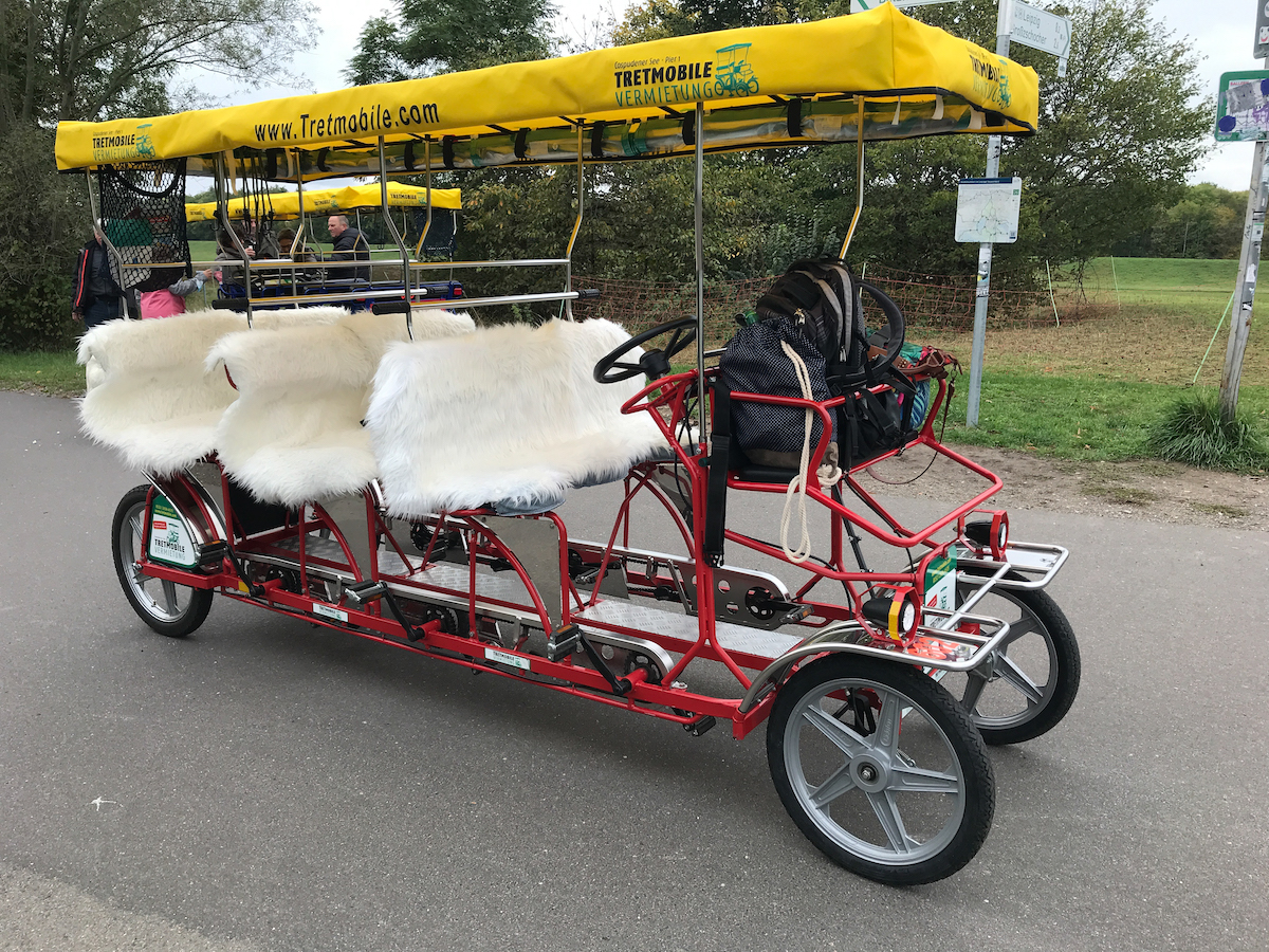 Eine der Damen hat also ein feines Programm ersonnen, eine andere eine Ferienwohnung für eine Nacht gebucht, und alle haben etwas mitgebracht. So trafen wir uns zum Auftakt am Cosbudener See zum gemeinsamen Mittagessen in der Pizzeria. Danach hatten wir ein fesches Sechserfahrrad gemietet, mit dem wir gemütlich in zwei Stunden den See umrundeten. 12 km mit diversen Fotopausen und Zwischenstops. Ok, es war auch ein bisschen anstengend, diese ungewohnte Art zu radeln, aber seehr lustig!