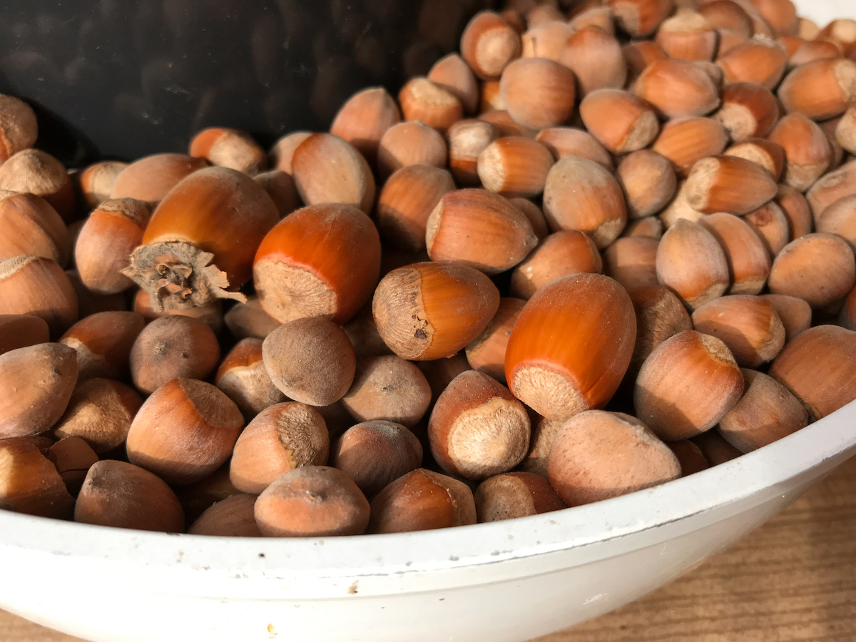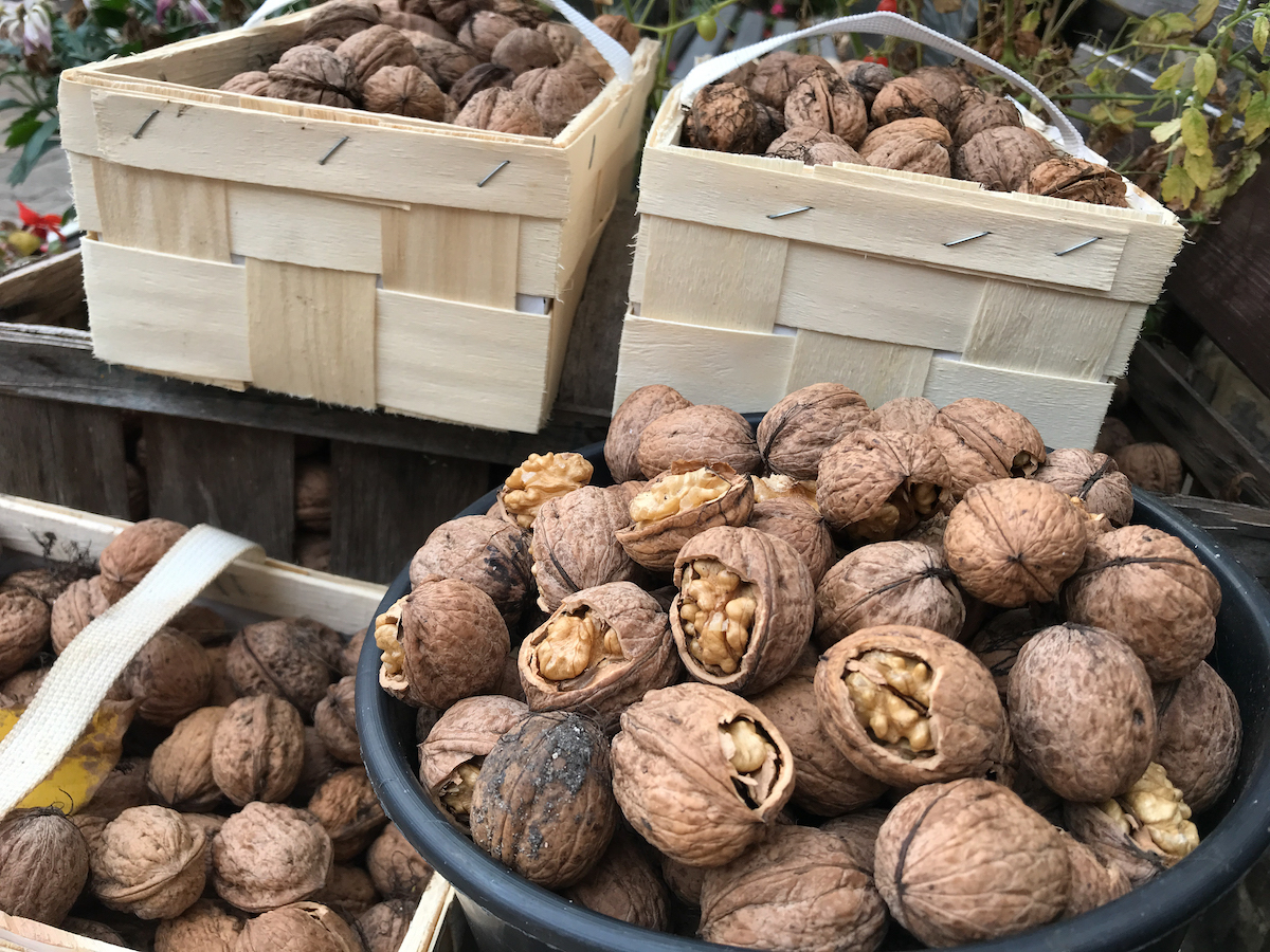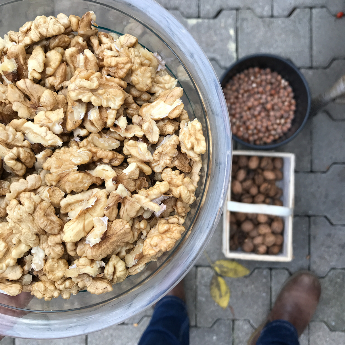 Aber mal weg vom Auto, das war nur die Vorgeschichte, warum wir überhaupt für so einen kurzen Zeitraum solch eine Reise machen. Immerhin sind es immer fast 500 km, die wir eine Strecke zurücklegen. Bei meinen Eltern genoss ich die Herbststimmung. Walnuss- und Haselnussbäume sorgen für Herbstschätze. Ich mag das sammeln und sortieren. Im Garten gab es noch frischen Salat und die letzten Gurken. Ich mag die Farben und die Stimmung auf dem Hof.