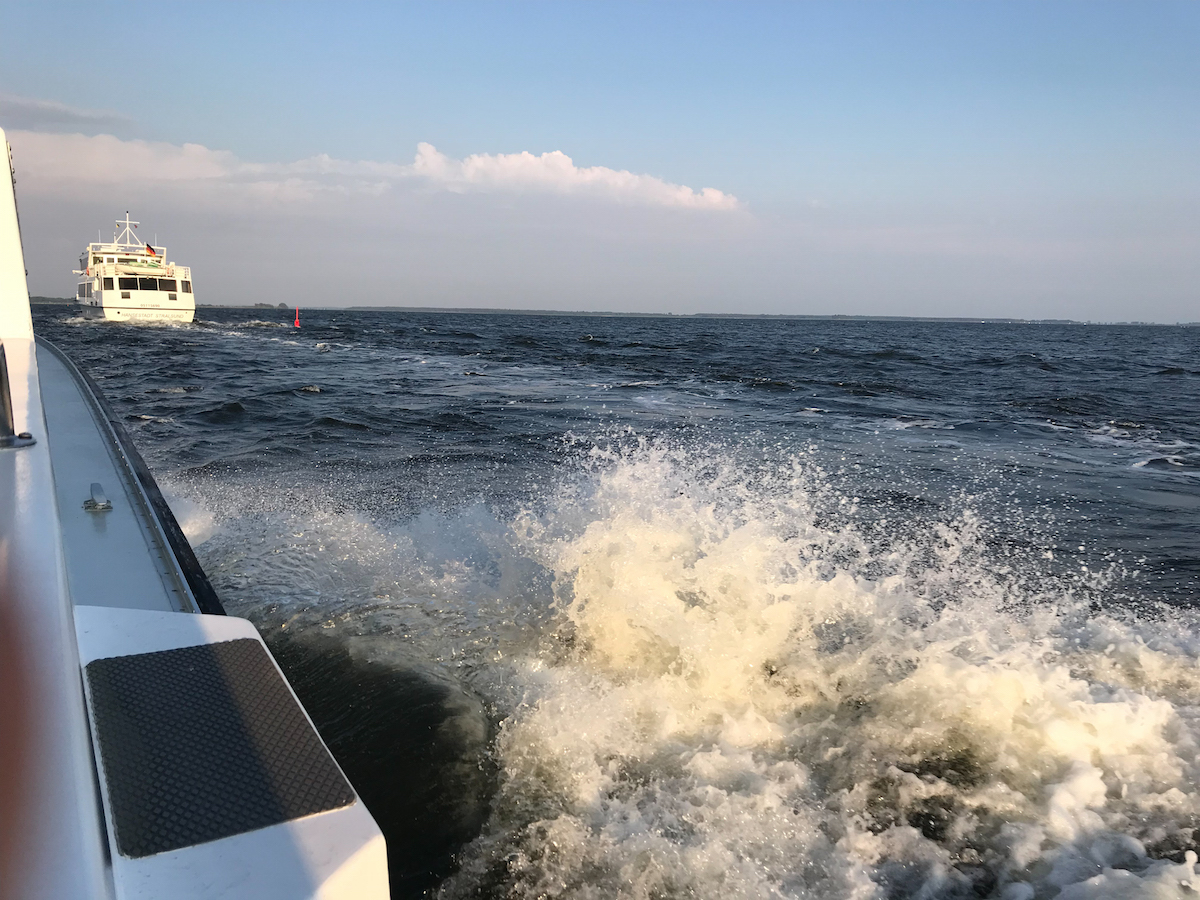 Fähre und Wassertaxi brachten uns an unseren endgültigen Urlaubsort. Das war alles sehr spannend. Wassertaxi fahren hat mir so viel Spaß gemacht. Das hat richtig im Bauch gekribbelt! Der Wind fetzte mir um die Nase, das Wasser spritzte und die Sonne tauchte den Abend in ein schönes Licht. Unterwegs sahen wir schon ganz viele Schwäne auf dem Bodden schwimmen. Am coolsten sind die Fluggeräusche eines Schwanes. Hatte ich vorher noch nie gehört. Unglaublich, was da für Kräfte am Wirken sind.