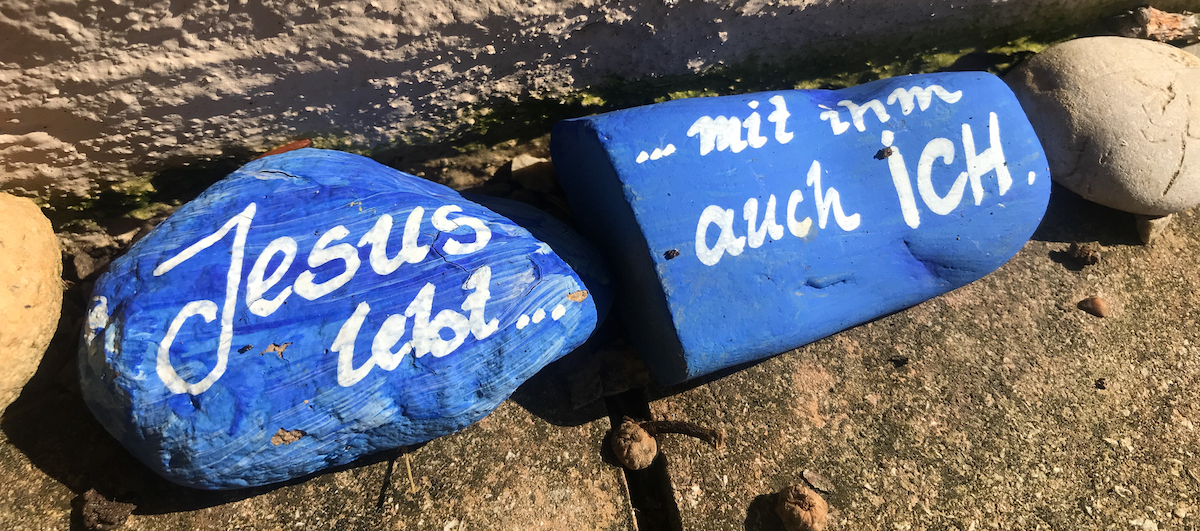 Ganz dem Blau-Thema folgend wandelte ich unter blauem Himmel, hatte zufällig sogar ein blaues Hemd an, entdeckte blaue Blüten und blaue Steine vor der Kapelle. Zu den bemalten Steinen habe ich im Mai schon etwas geschrieben. Die Steinreihen wachsen. Ich schaue mir die Motive und Botschaften so gern an. Von diesem Spaziergang habe ich mir übrigens mein Monatsmotto für August mitgenommen: gehe langsam.