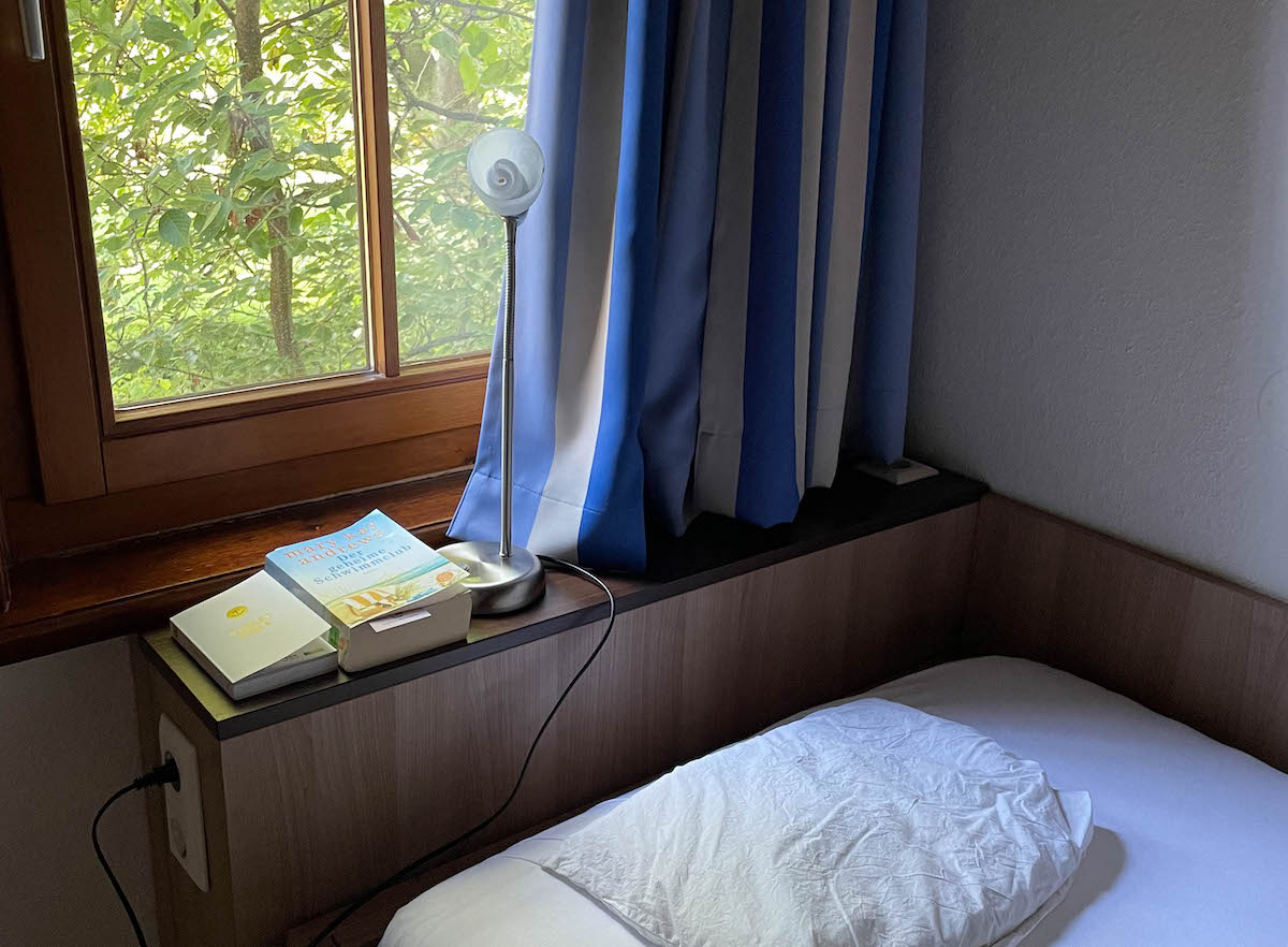 Ich hatte ein kleines gemütliches Einzelzimmer im Don Bosco Haus. Das mag ich ja immer sehr: Bett, Tisch, Stuhl. Fertig. Die Einfachheit und Reduzierung. mal Abstand von der Fülle des Alltags, dem Besitz. Auf Reisen nehme ich immer mein eigenes kleines Dinkelspelzkopfkissen mit.