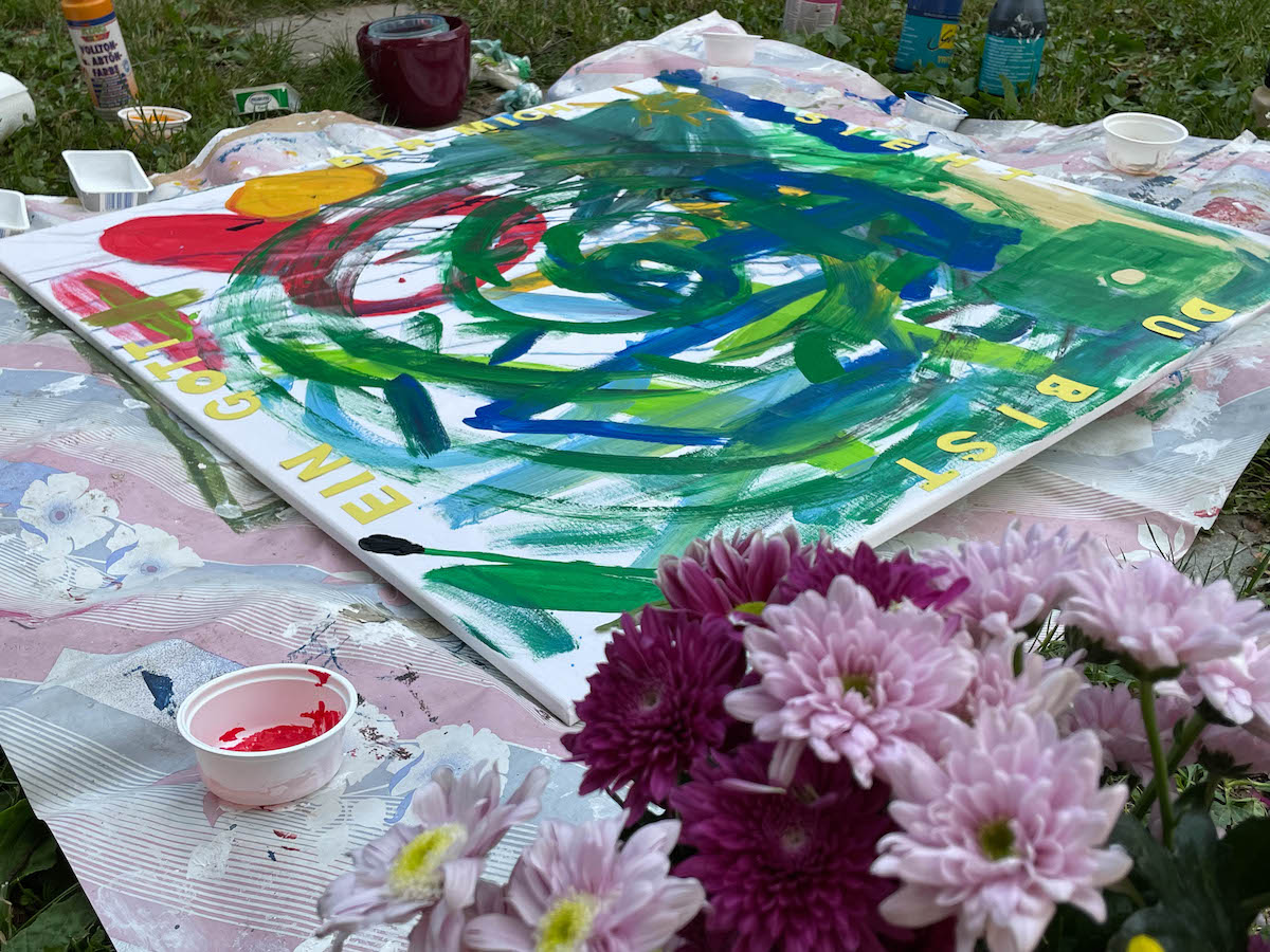 Nach der Begrüßung und dem Abendessen gab es eine erste gemeinsame Vorstellungsrunde mit einer persönlichen Geschichte einer Mitarbeiterin zum Thema “Du bist ein Gott, der mich sieht”. Auf einer großen Leinwand durfte jeder eine Farbe und ein Symbol hinterlassen. Das Ganze wurde dann vom Text des Einstiegsthemas gerahmt und war unser Bild für das Wochenende.