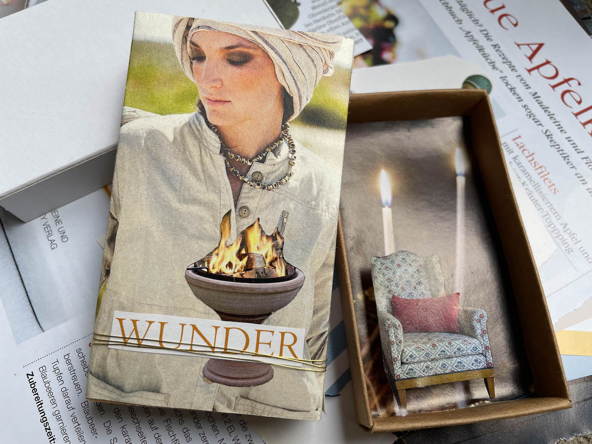 Weil der Garten eine große Kreativstrecke war mit vielen Stationen, sind wir immer wieder miteinander ins Gespräch gekommen, konnten einander über die Schulter schauen und uns gegenseitig inspirieren. Das war eine ganz schöne Stimmung. Ich habe zwei kleine Collage-Schachteln gestalten, aus Resten einen kleinen Miniblütenkranz gebunden und aus Holzresten zwei Engelchen – einfach meinen Impulsen folgend.