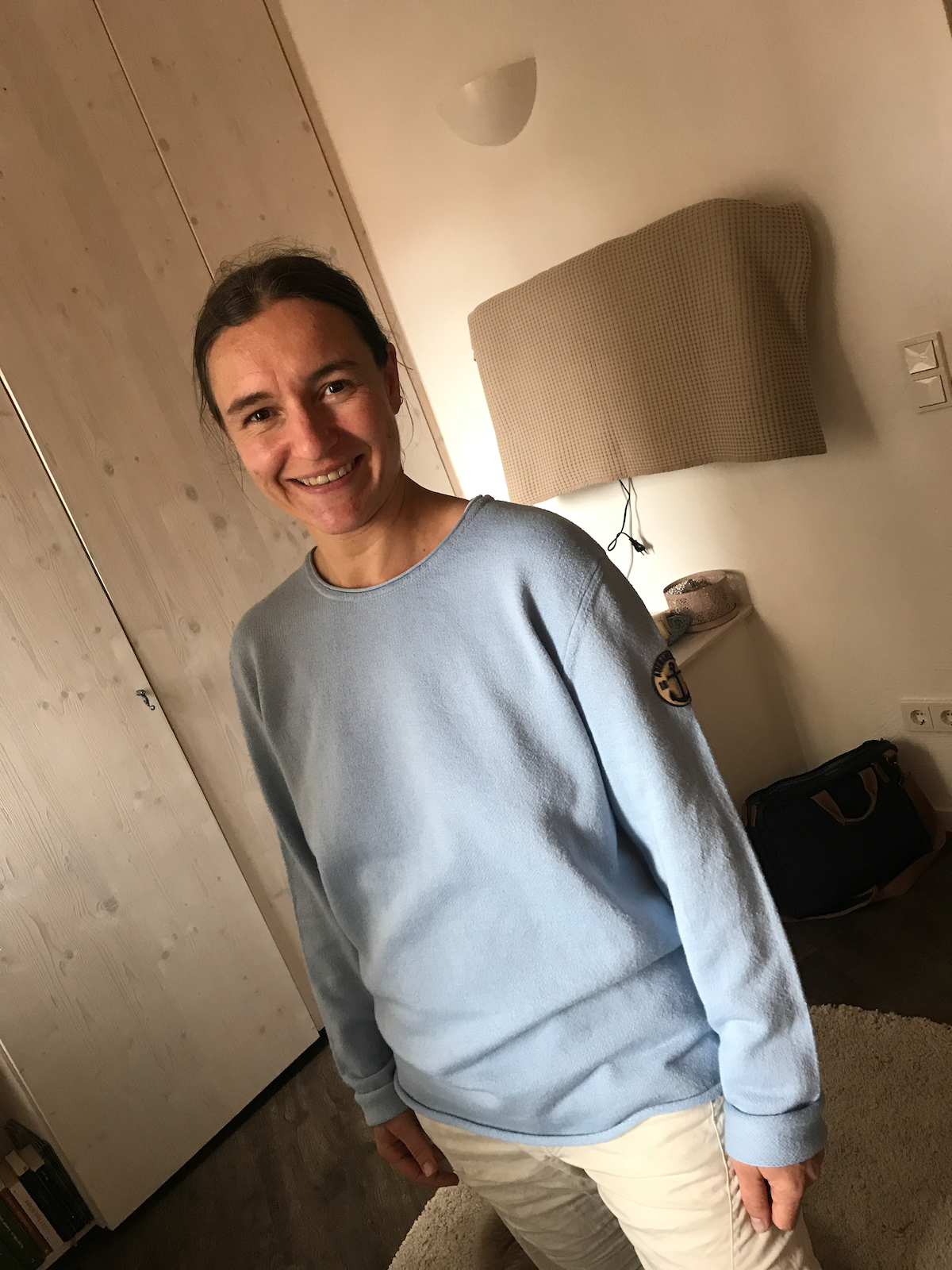 Auf meinem Bummel entdeckte ich auch einen Laden, der maritime Adenauer-Mode verkauft. Die Modepuppe vor der Tür hatte einen sehr schönen hellblauen Pullover an, den ich toll fand. Zurück von meinem Vormittag überredete ich den Mann später noch einmal zu einem Stadtbummel mit mir. Ich probierte den Pullover (eigentlich ein Männermodell), befand ihn für gut und kaufte ihn. Auch der Mann entdeckte ein schönes Streifenteil für sich. Wir beobachteten nochmal gemeinsam die Eisvögel und schlenderten zurück zum Häuschen für unseren Vollmond-Abend im Garten.