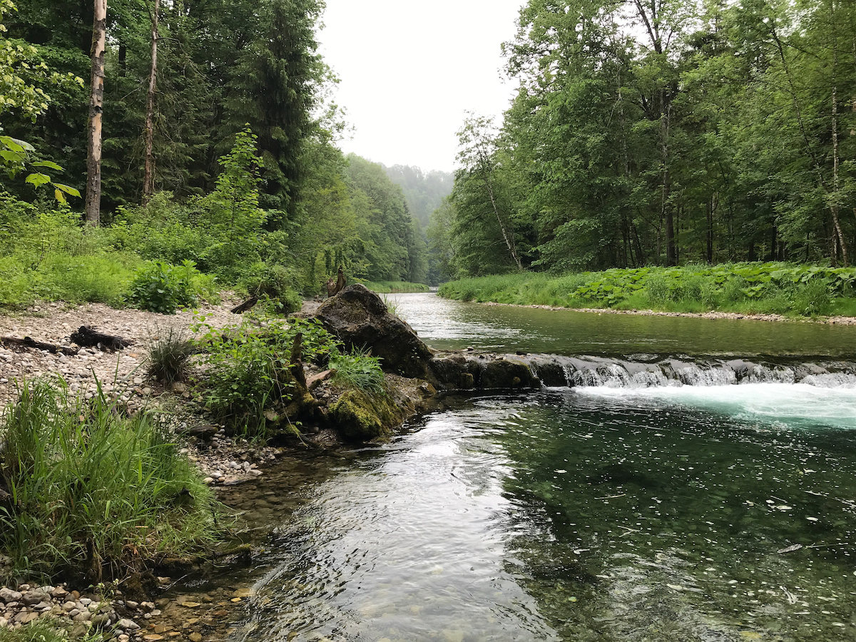 Laut meiner Karte musste es eine Brücke über den Fluss zur anderen Seite geben, wo ich auf dem ausgeschilderten Jabobsweg dann zurück zum Auto gelangen würde. Nur wusste ich im Wald nicht, an welcher Stelle ich mich befand. Ich wollte Zeit sparen und durch das Wasser waten, um zur anderen Seite zu gelangen. Der Versuch scheiterte, weil das Wasser soo kalt war, dass mir die Füße weh taten. Und der Fluss so breit, dass ich mir nicht zugetraut habe, barfuss über die glitschigen Steine durchs Wasser auf die andere Seite zu gehen. Also doch auf dem Weg entlang die Brücke finden.