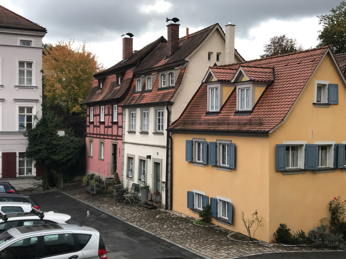 Bamberg wurde im Krieg kaum zerstört, sodass die mittelalterliche Bauweise und histroische Stadtstruktiren über mehrere Jahrhunderte noch gut erhalten sind. Deshalb wurden drei Stadtteile von Bamberg zum UNESCO Weltkurlturerbe ernannt. Es gibt eine Vielzahl von kleinen schiefen Häuschen und engen Gassen. Eine kleine Zeitreise. Dazwischen thronen riesige Kirchen und der Dom. Wir haben wirklich viele davon besichtigt und doch nicht alle gesehen. Ich mochte die kleinen Details an Türen und Fenstern ebenso wie die Farbigkeit der Häuser. In einem solchen Häuschen hatten wir unsere Unterkunft. Das kleine weiße im Bild.